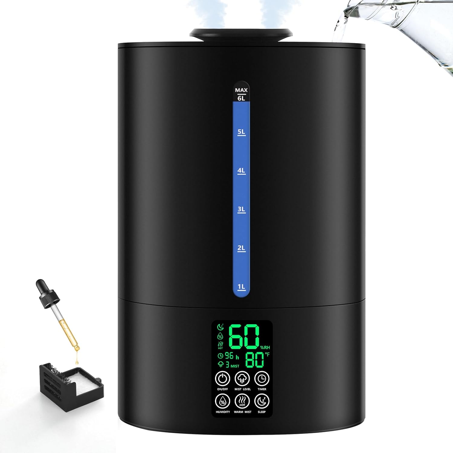 6L Humidifiers for Bedroom Large Room Home, Cool and Warm Humidifier for Plants Mist Top Fill Desk Humidifier Essential Oil Diffuser, Quiet Humidifiers with Adjustable Mist,360°Nozzle-Black