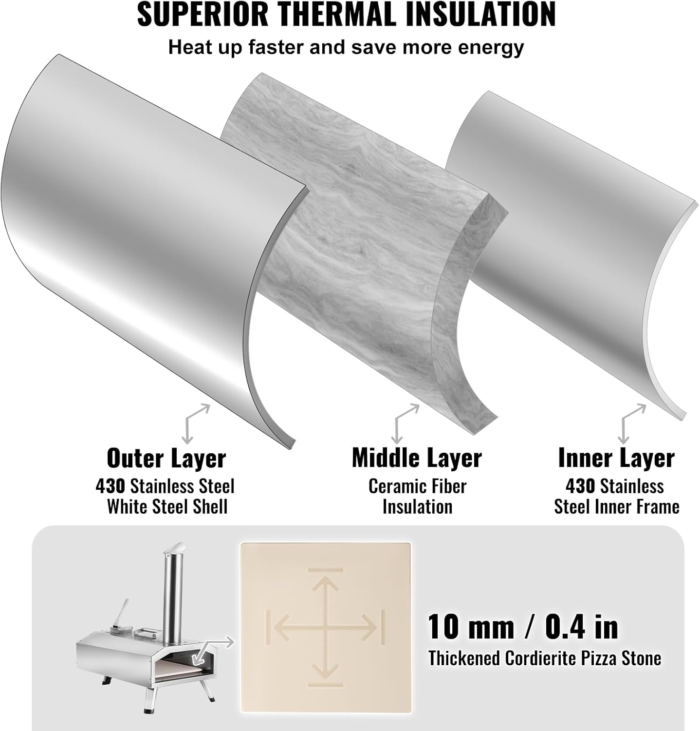 - 🍕 Durable Construction: VEVOR multi-fuel pizza oven withstands outdoor conditions and frequent use. Adopted a 3-layer design, promoting efficient heat circulation. Featuring a 430 stainless steel shell, and thick insulation cotton, it ensures durability and excellent heat retention