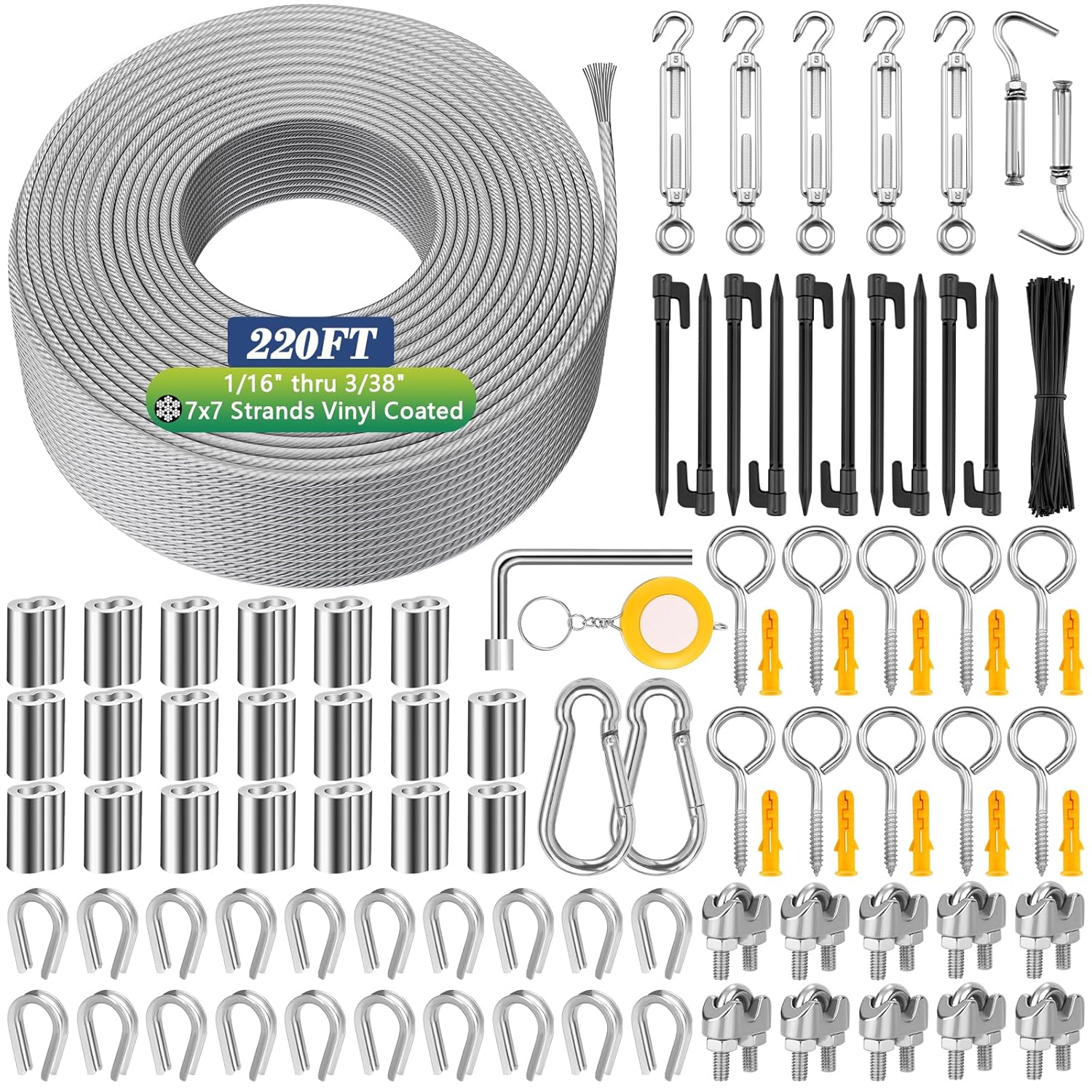 - [192 Pcs Steel Wire Cable Kit] Comkrivy steel cable kit offers more accessories than any other product. It comes with 220 FT 1/16 inch vinyl coated stainless steel cable wire, 20 M3 thimble, 20 M3 aluminum sleeve, 10 M3 wire rope cable clip clamp, 5 M5 turnbuckle tensioners, 2 M5 clips, 10 M5 sheep eye screw hook, 10 M5 plastic anchors, 2 M6 expansion hooks, 10 black tent pegs, 1 socket wrenches, 1 tape measure and 100 black twist ties to meet your different hanging and decoration needs