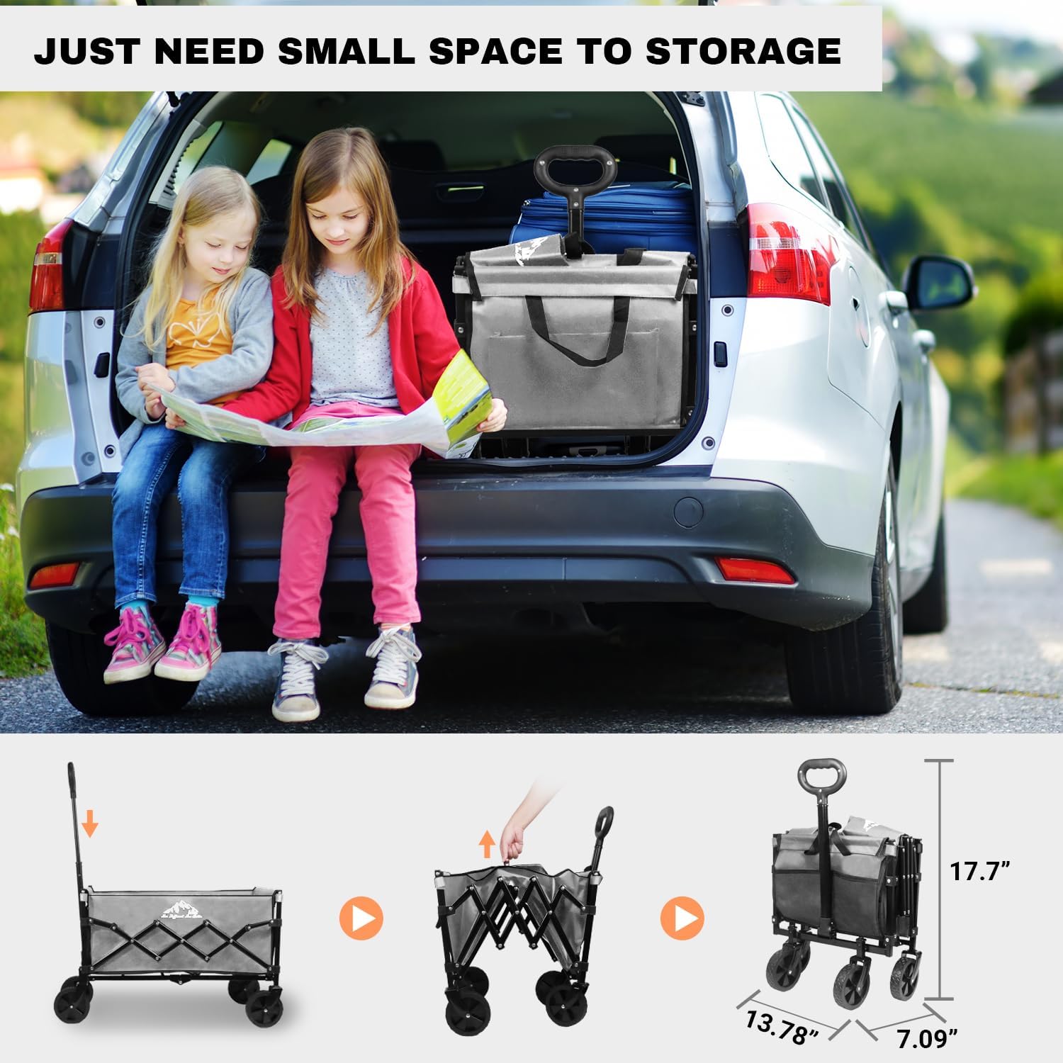 - FOLDING IN ONE SECOND, NOT TAKING UP SPACE: The folding cart can fold in a few seconds, surprising you! Upgrade the beach buggy with a reasonable structural design, reducing its folding size to about 7.09 inches x 13 inches x 17.7 inches, achieving the smallest space to place this little guy!