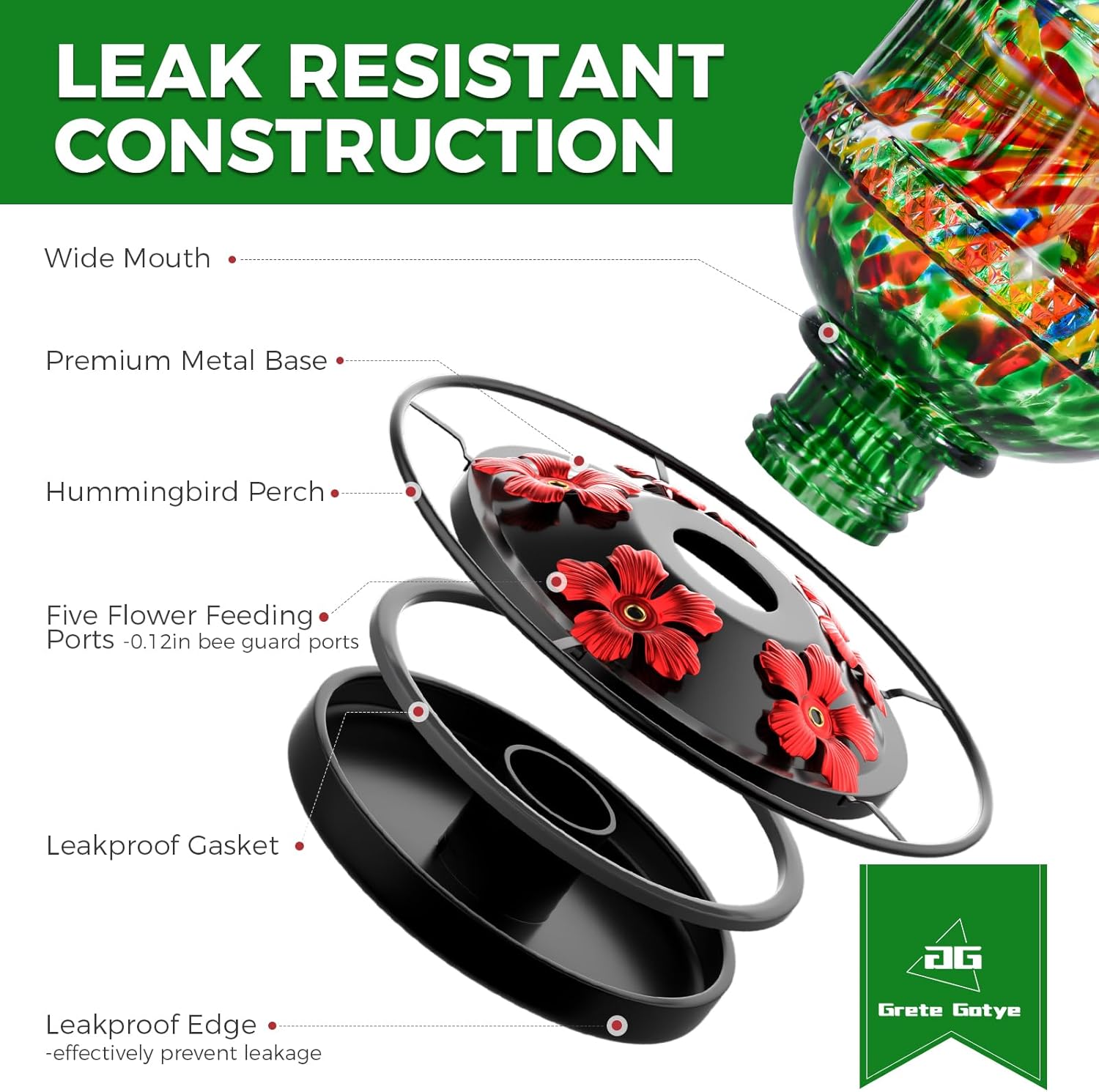 - 💧LEAKPROOF FUNCTION: Built-in durable gasket, unique design makes base connection proper and seamless, even when the hummingbird feeders for outdoors hanging are shaken by wind or birds perching on it. After filling the container and screwing it onto the base, flip it over and hang it on a tree/deck hook/shepherd's hook/hangers/window hook.