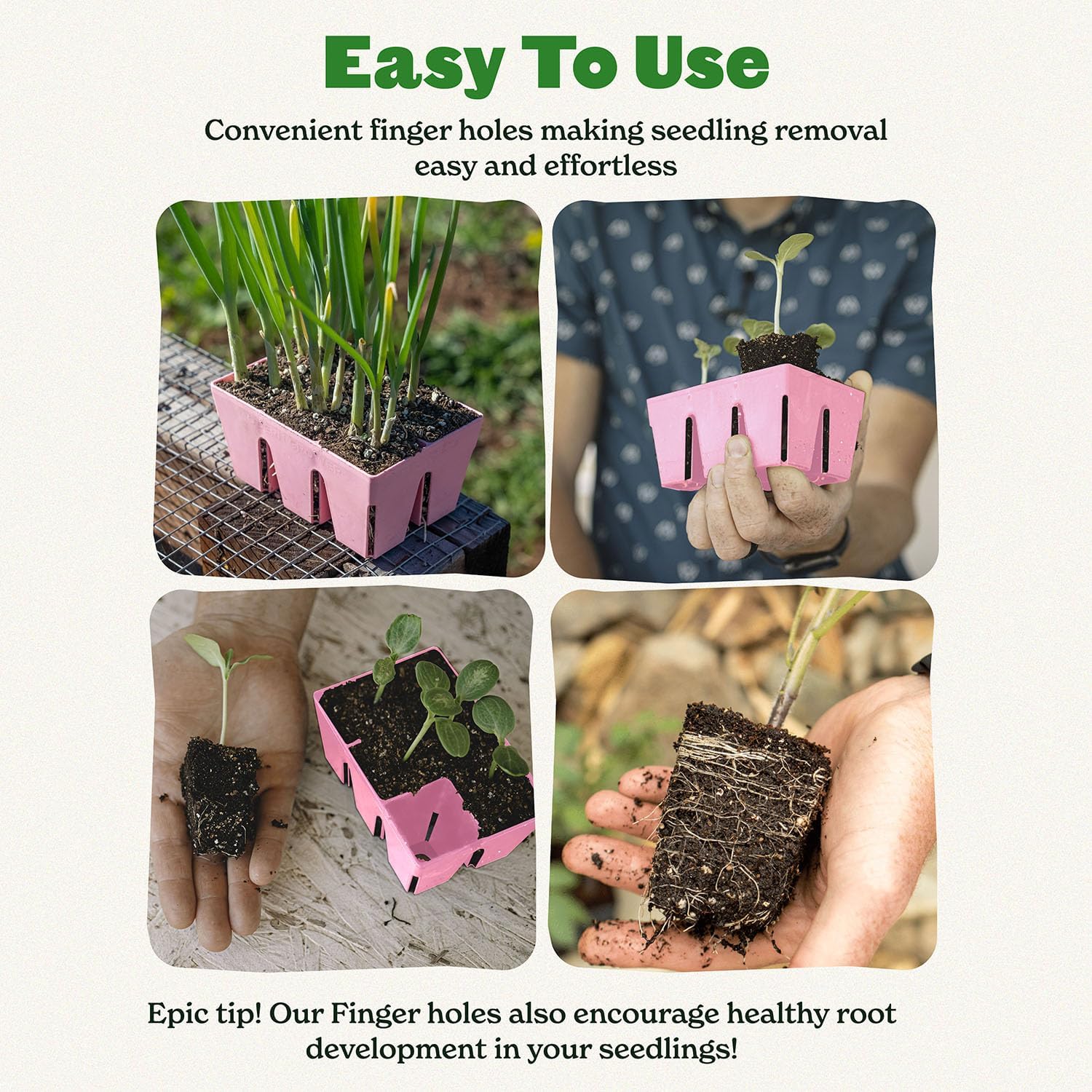 - No more crushed seedlings!: Forget the frustration of digging or using tools to remove seedlings. Our seedling starter trays feature large finger holes on each cell bottom. Simply push gently with your finger, and voila – your seedling pops out effortlessly, ready for transplanting.