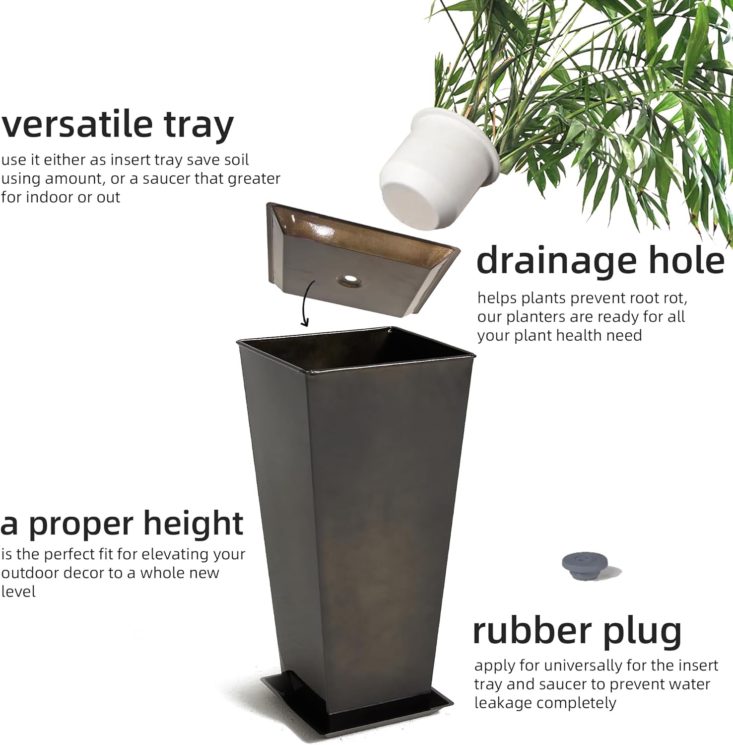 KOL 28''H. Tall Galvanized Steel Glazed Planter with Insert, Set of 2, Planter Pots for Indoor & Outdoor Use, Decorative Flower Plant Pots with Drainage Hole for Front Porch, Patio, Deck - Black