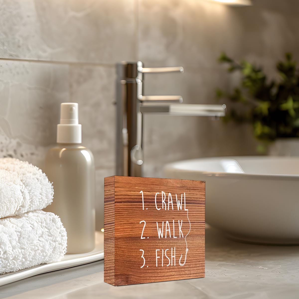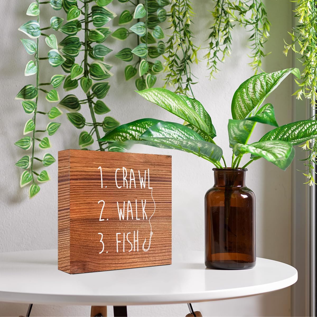 Brown Country Crawl Walk Fish Rustic Wooden Sign Desk Decor,Funny Baby Fishing Wood Block Sign Desk Decorations for Home Bedroom Baby Room Shelf Table Decor
