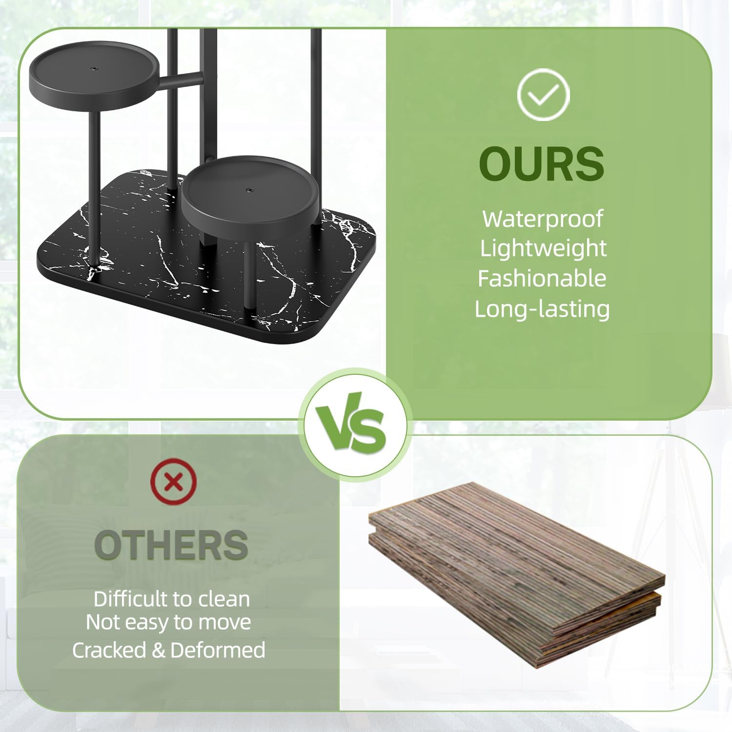 - Modern Marble-Style Base: The plant stand indoor corner's faux marble PP base adds a modern, stylish touch to your home decor. It complements contemporary interiors, enhancing your space's aesthetic appeal. Elevate any room with this elegant plant stands