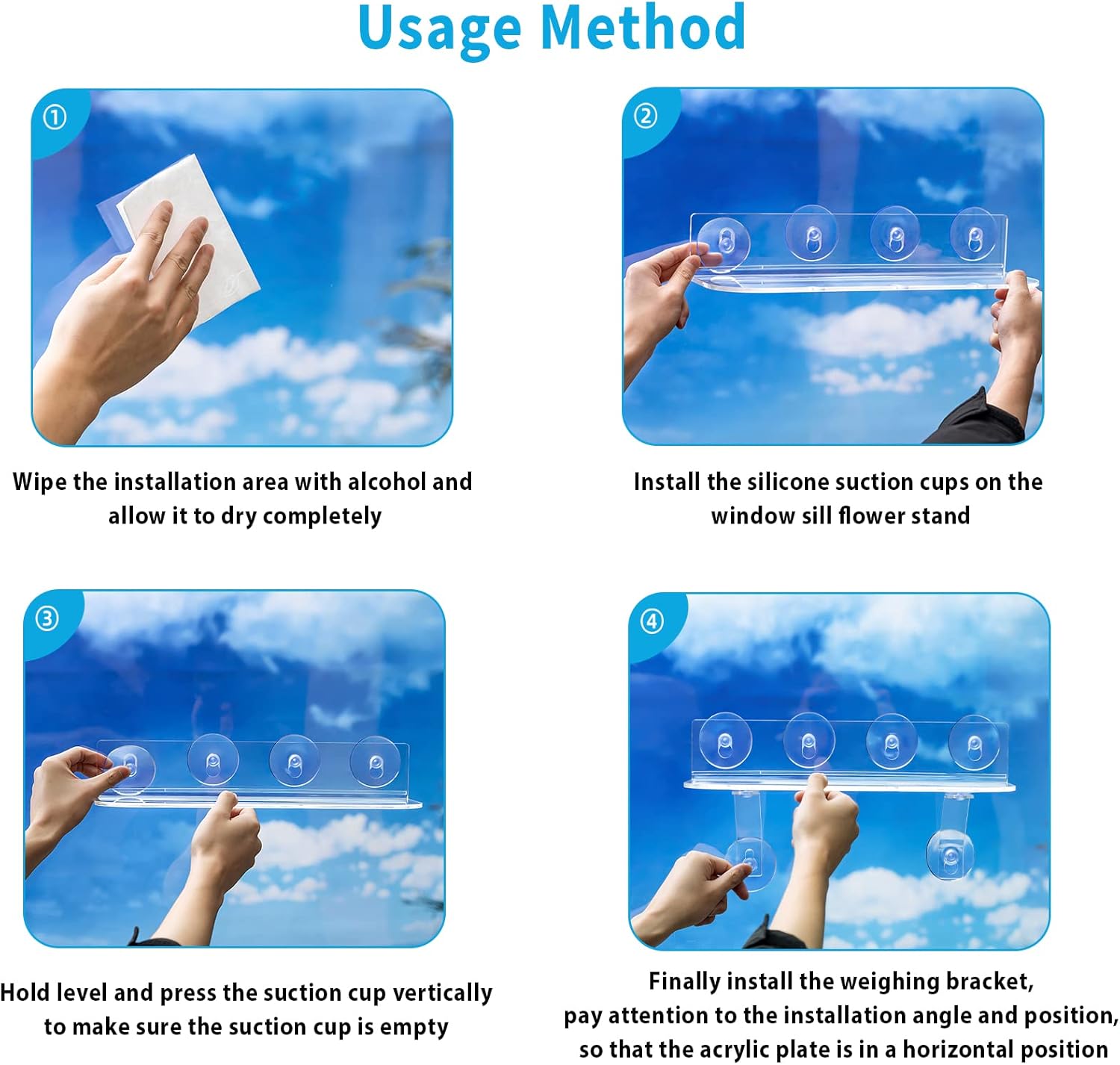 - Simple Assembly Process: After cleaning the surface with alcohol or a clean towel, wait one minute for it to dry completely. Then the suction cup window sill extender holder can firmly adhere to glass, mirrors, and smooth tiles. It's an excellent space-saving and organizing solution