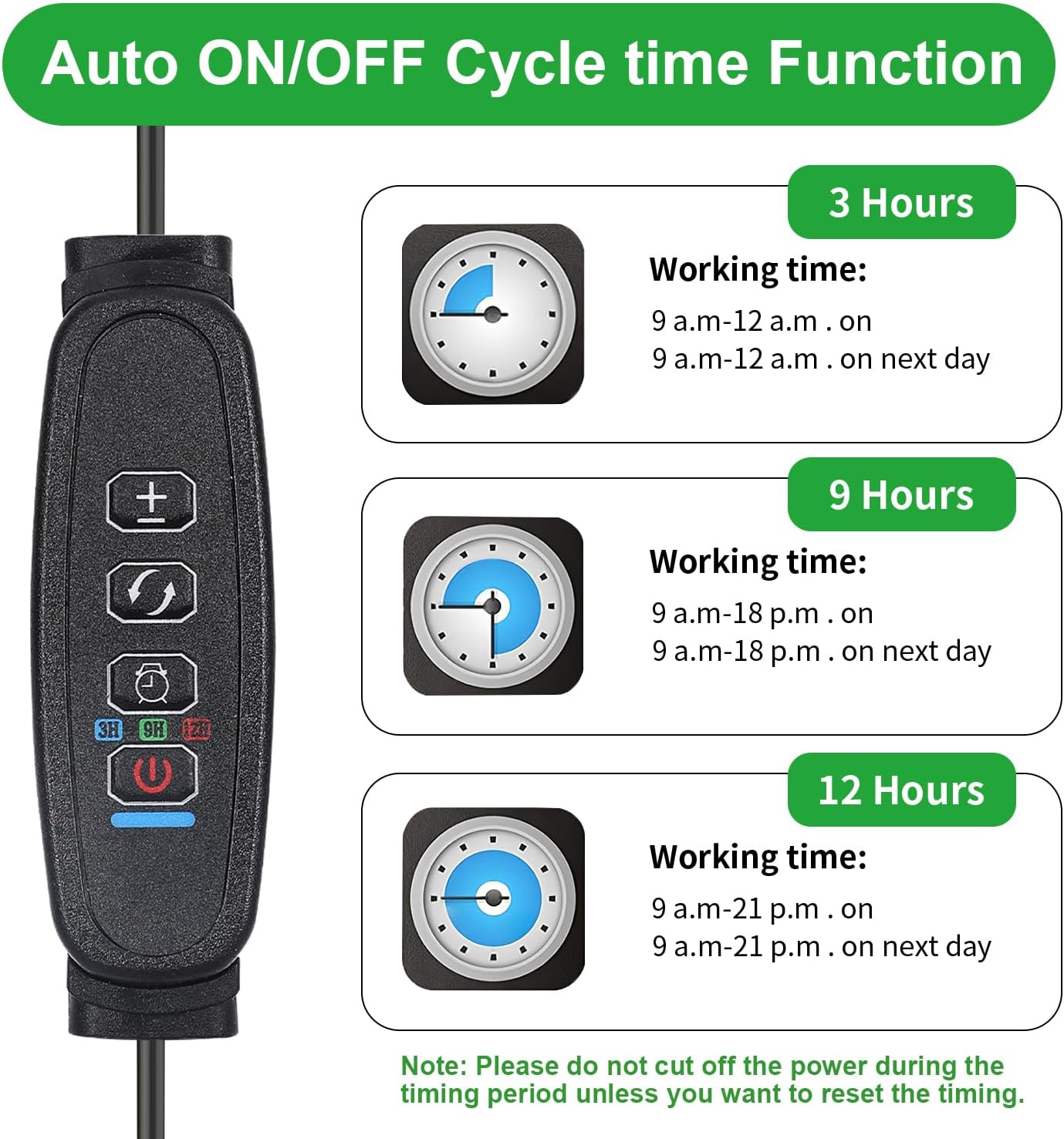 - 【Auto On/Off & Timing Function】The plant grow light comes with a cycle memory timer function, which can Auto turn on/off every day according to your settings: 3/9/12 hours, the grow light will Auto turn on and off at the same time the next day, no manual operation is required, it can take care of your plants when you on work or vacation.