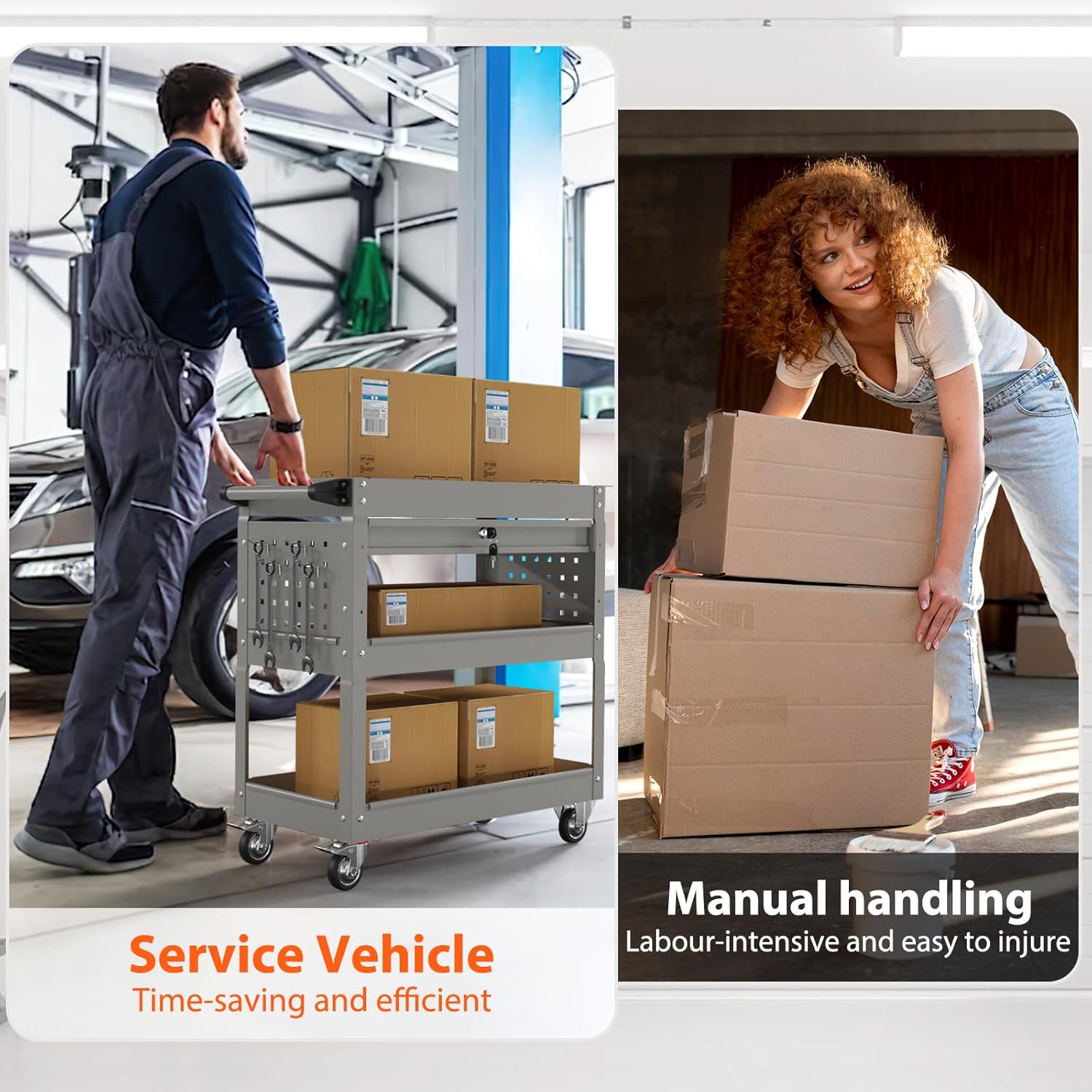3-Tier Heavy Duty Utility Cart on Wheels, Rolling Tool Cart on Wheels with a Drawer, 350 Lbs Load Capacity Service Cart for Warehous, Garage and Repair Shop (Grey)