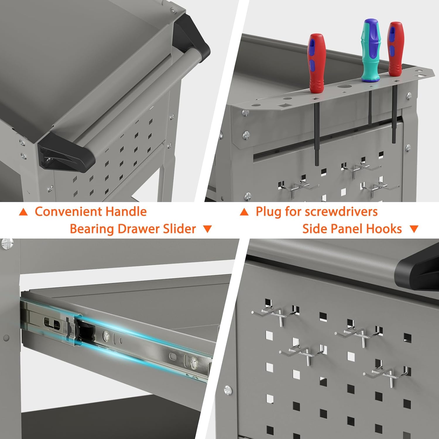 - 🔨【Multiple Storage Options】: This tool cart has 3 trays, a lockable drawer, tool slots of various sizes, and a hanging board with 4 hooks, the tool cart gives your tools finally have their designated spots. No more searching or mess.