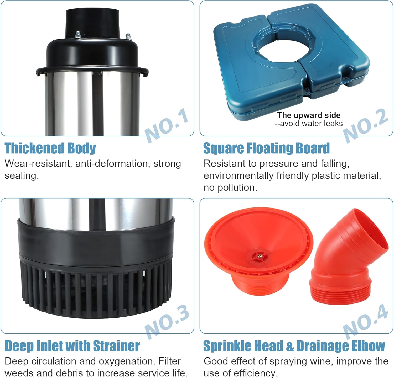 - RELIABLE PROCESS & FEATURES: Floating fountain system designed to aerate and decorate large bodies of water, with low-profile float design that remains balanced for easy upright positioning in water. The fountains promotes a clear and clean pond while removing most surface debris to ensure a picturesque lake or pond, and can dissolved oxygen balance, purify water quality, increase water circulation, improve water ecolog of the lake, etc