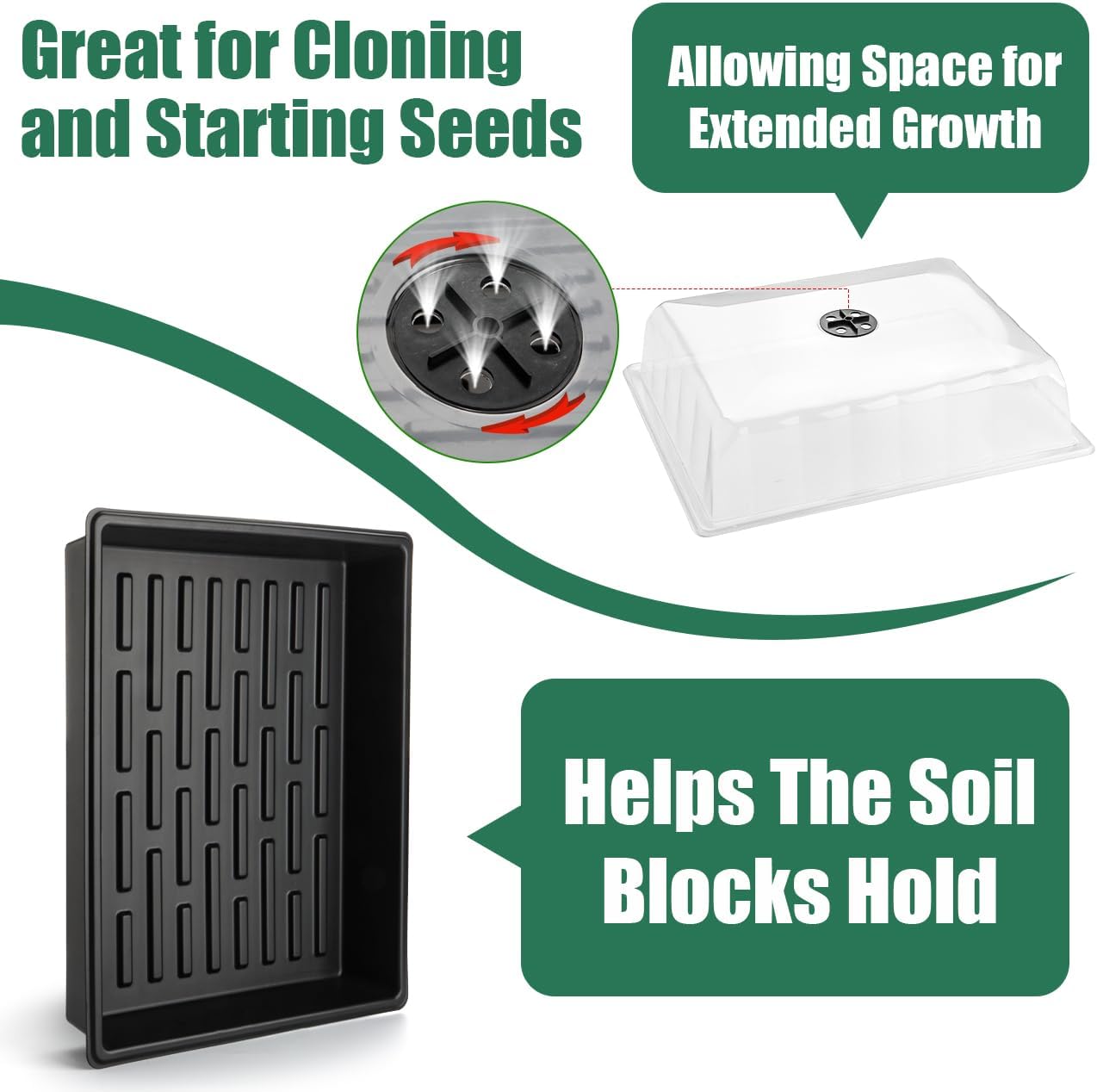 - 【4'' Drip-proof Dome】Say goodbye to messy condensation! Our dome is expertly designed to channel water back into the seed tray, so you’ll never have to deal with leaks or spills. The tall, transparent dome provides ample space for seedlings to thrive for weeks, while the adjustable air vents allow you to control airflow effortlessly. Plus, the clear design ensures maximum light penetration and a clear view of your growing plants.