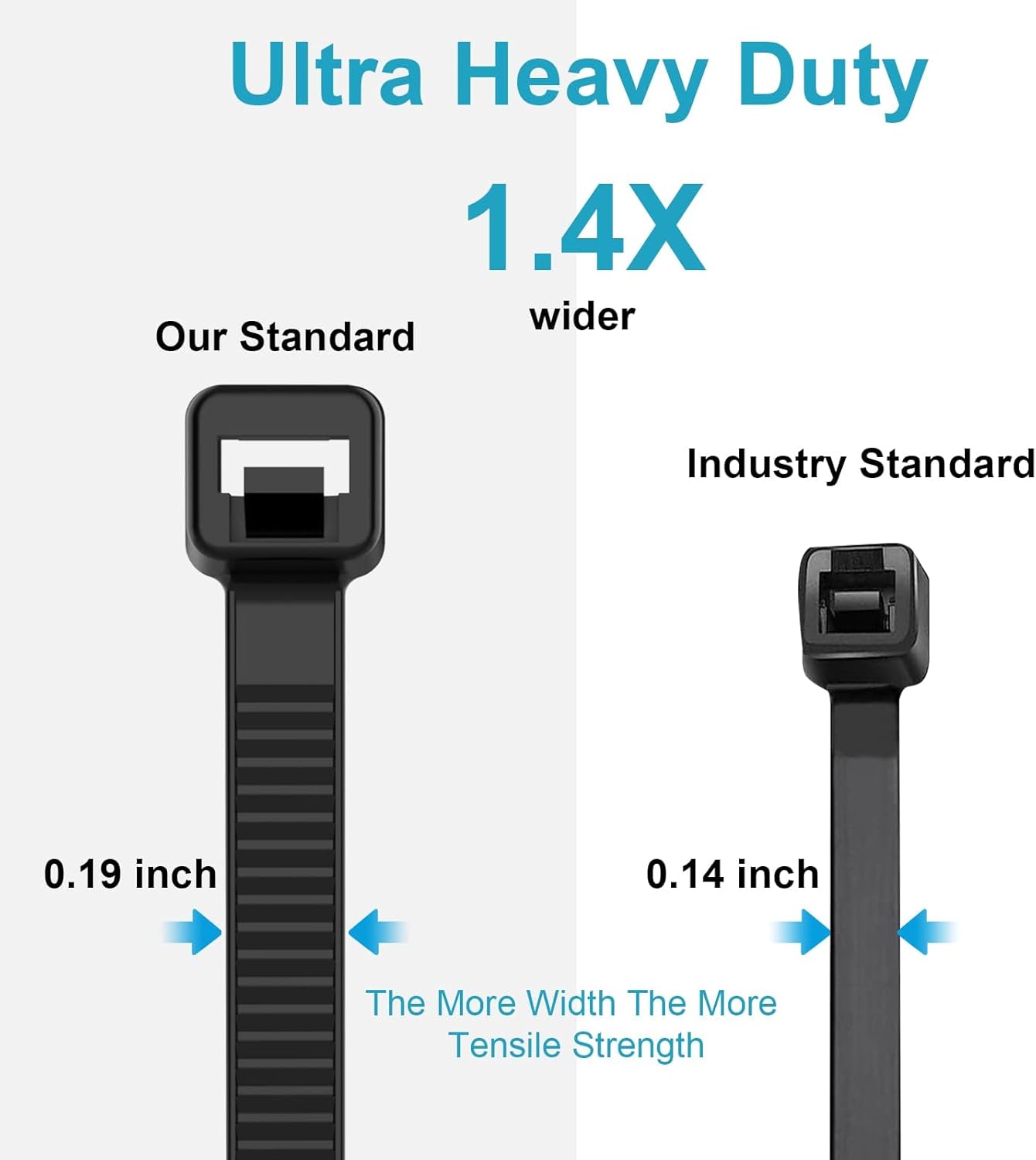 - 【100lb Tensile Strength】: The more width and Thickness, the more tensile strength. our zip ties 14 inch width is 0.19 inch(4.8mm), while industry standard is 0.14 inch(3.6mm), our zip ties 14 inch Thickness is 0.065" inch(1.65 mm), while industry standard is 0.05 inch(1.25mm),more tensile strength.