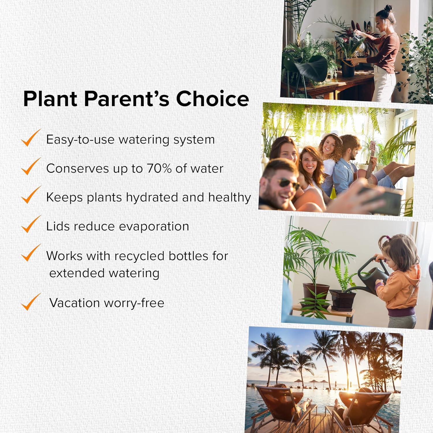 - Vacation-Friendly: Keep your plants thriving and water plants while away. Simply fill the plant stake with water, secure the lid, and let it do its job. For extended trips, you can replace the lid with an inverted bottle full of water. Any small bottle with a neck that fits the spike will work perfectly, providing a continuous water source while away.