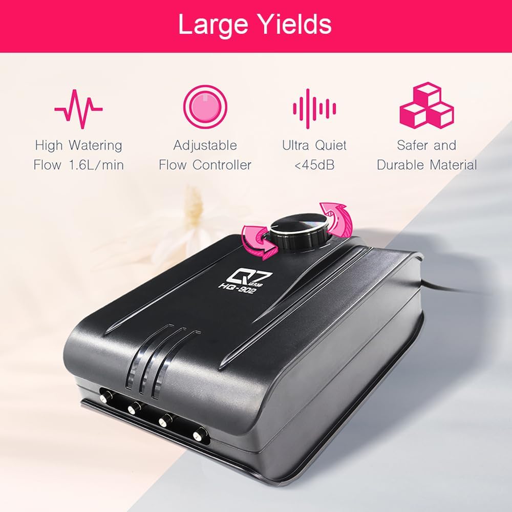 - EFFICIENT AIR PUMP KITS: Air Pump with 4 outlets, includes 4x Check Valve, 4x Air Stone, 4x 5ft Air Tubing. Large air outlet, adjustable air flow is up to 1L/min and UP TO 265 gallons. Air Stone is an ideal way to add oxygen to your hydroponic growing system and create tiny bubbles rather than bigger ones. Oxygenation of hydroponic reservoirs using air pumps is vital for the health of root system.