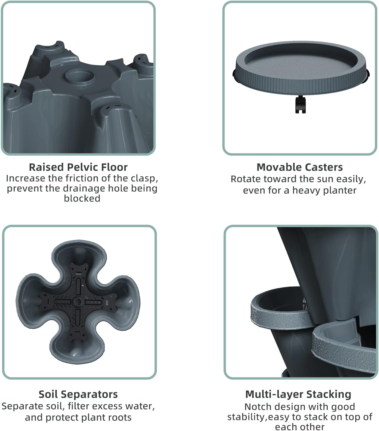 7 Tiered Strawberry Vertical Planter Tower Garden 3 Pack, Stackable Planter Herb Garden Planter with Movable Casters and Bottom Saucer Indoor and Outdoor - Dark Grey