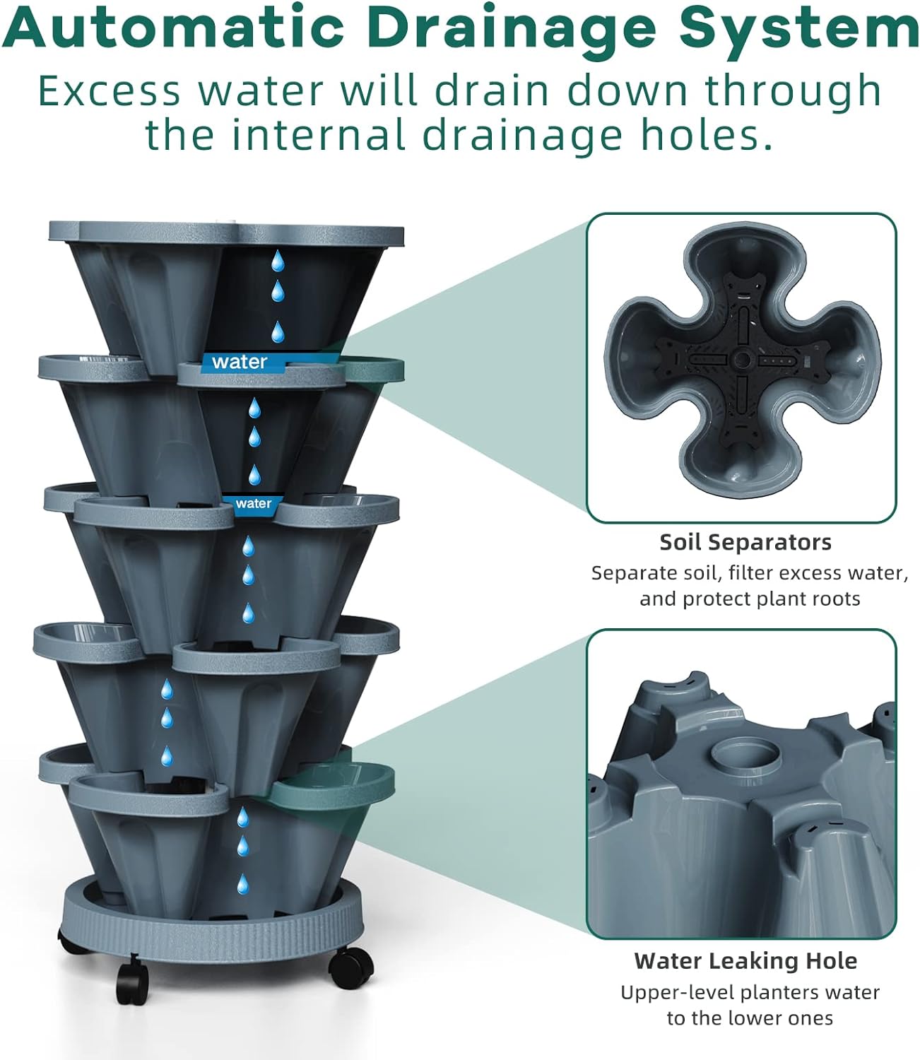 - 7 Tier Vertical Planter - 7 tier stacking planter, made of BPA-free material, can hold up to 28 different plants, such as strawberries, spinach, leaf lettuce, arugula, and mustard greens, and a few smaller herbs and flowers. Plus, it's the perfect vessel for strawberries as the berries cascade over the container lip.