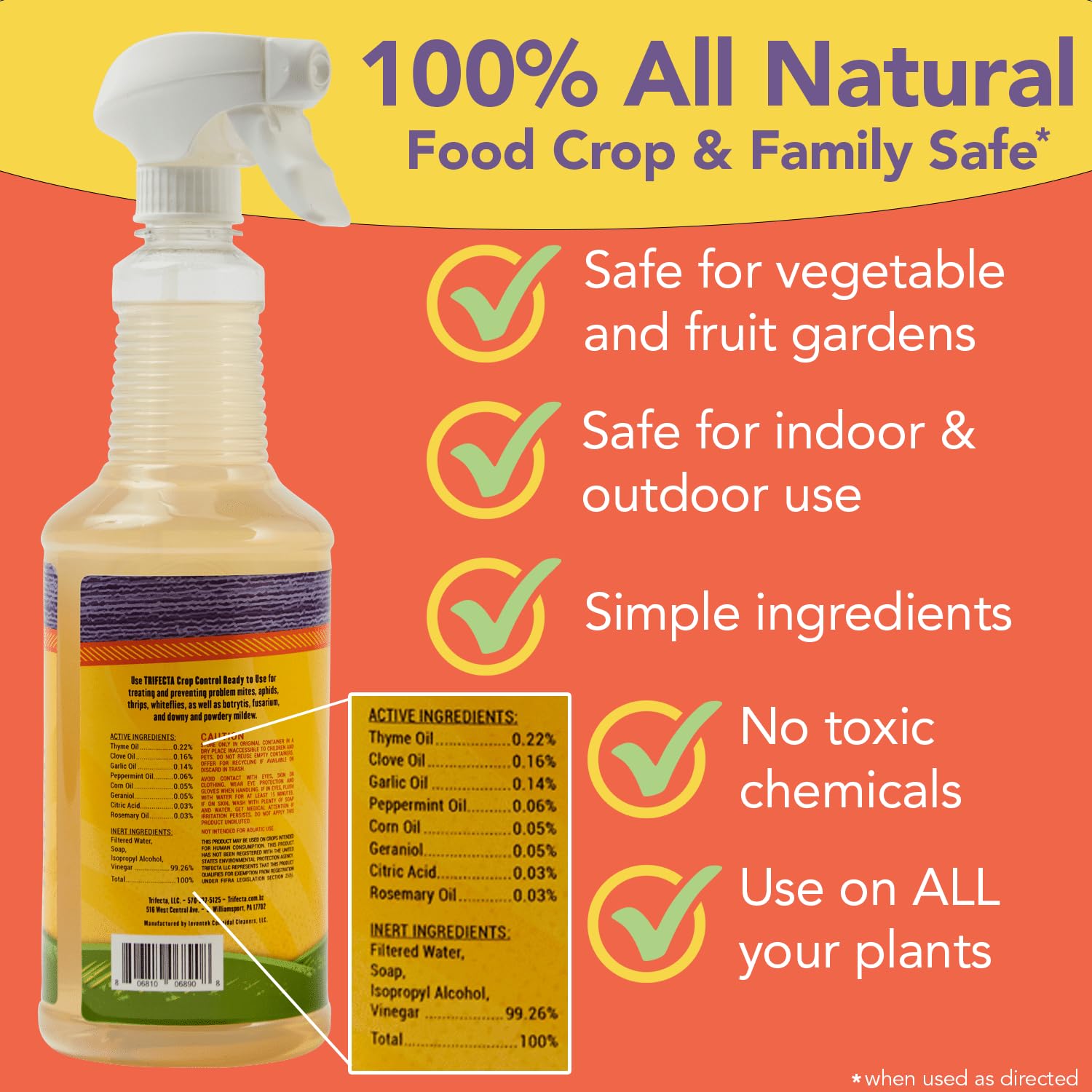 - CROP, GARDEN & HOUSEPLANT INSECT CONTROL. Trifecta Crop Control all-natural, plant-based formula effectively combats destructive spider mites, aphids, whiteflies, fungus gnats, and other soft-bodied pests on indoor and outdoor plants. Our biodegradable, eco-friendly solution is safe for use on edible crops, without chemical residues. Our gentle yet potent plant spray suffocates and dehydrates pests without harming beneficial insects or the environment, making it ideal for organic gardening.
