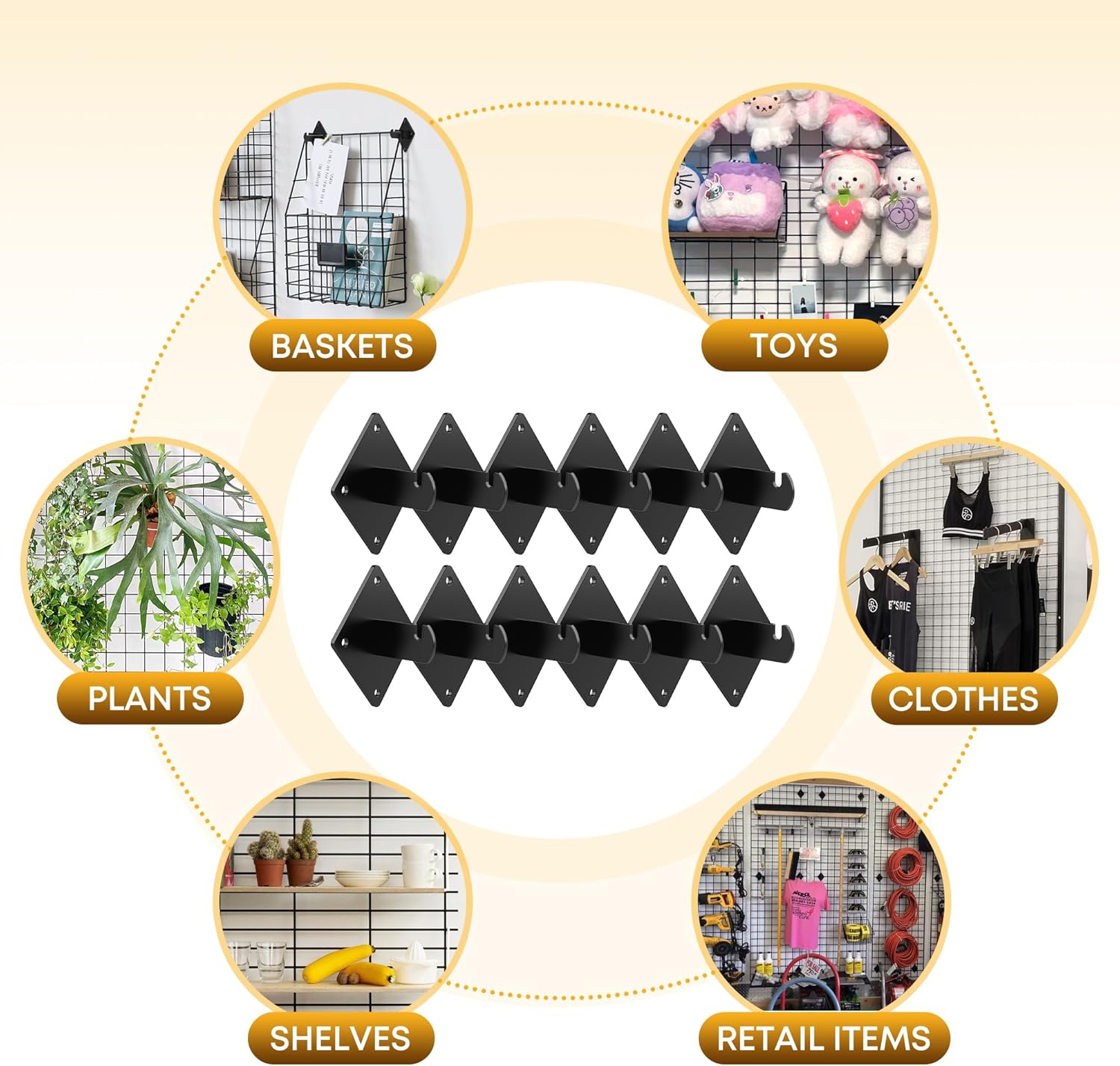 - 【Easy to Install】:The gridwall mounting mracket has 4 pre-drilled screw holes in the back plate, simply screw them into the wall and hang the gridwall panels on the bracket to ensure that the Gridwall is securely fastened to the wall. Gridwall accessories allow your gridwall to ensure the stability of the grid panels even when displaying heavier items