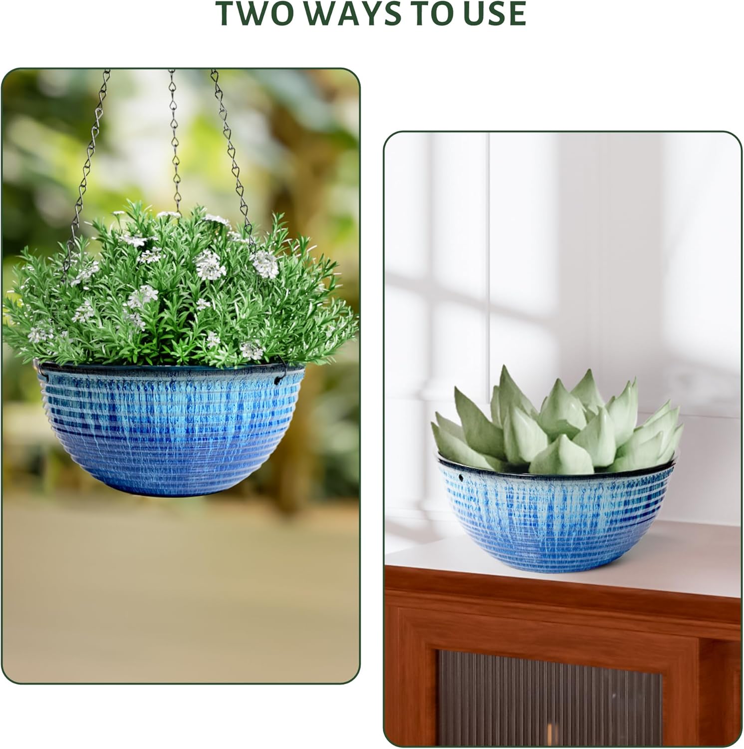 10inch Hanging Planters for Indoor and Outdoor Plants, 2 Pack Hanging Planter with Drainage Hole, Round Hanging Flower Pots for Garden Home Decor (Blue Glaze)