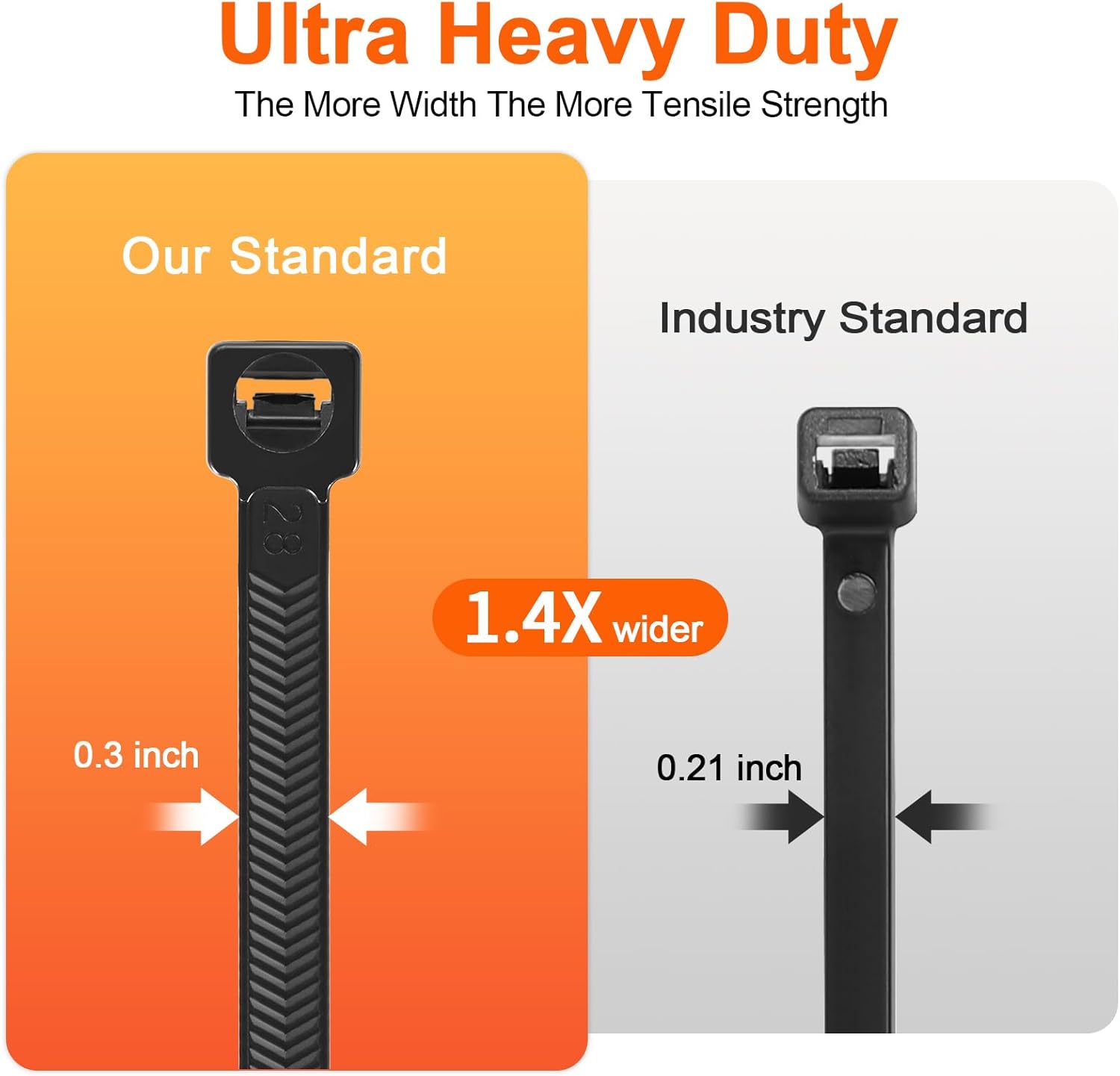 - 【250lb Tensile Strength】: The more width and Thickness, the more tensile strength. our zip ties 12 inch width is 0.3 inch(7.6mm), while industry standard is 0.19 inch(4.8mm), our zip ties 12 inch Thickness is 0.076" inch(1.95 mm), while industry standard is 0.055 inch(1.38mm),more tensile strength.