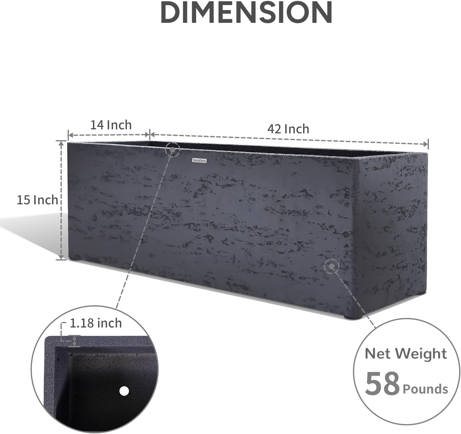 42 Inch Rectangular Concrete Planter(42Lx14Wx15H,58 Pounds),Durable All-Weather Use with Drainage Holes,Large Rectangular Planter for Outdoor Indoor Plants