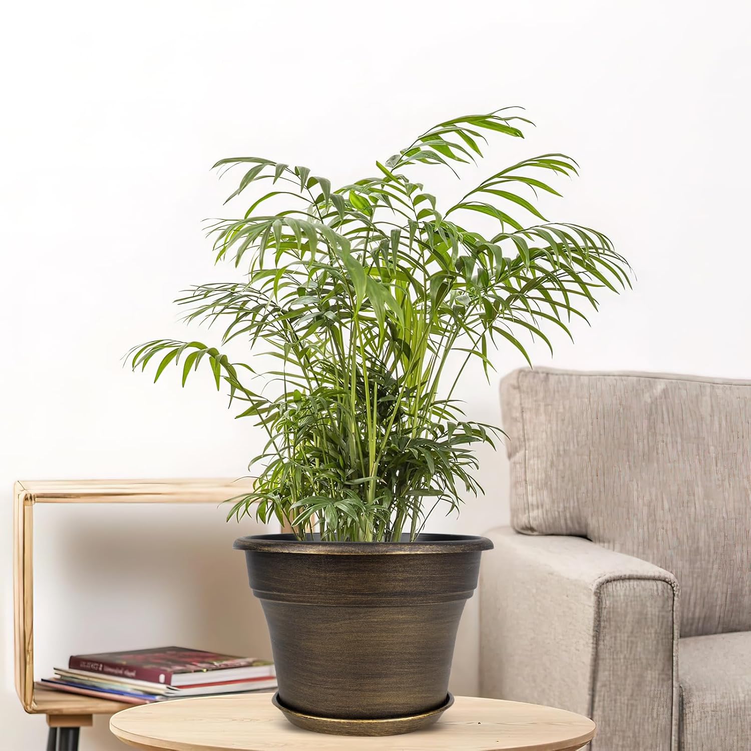 - 【TRADITIONAL DESIGN】Plastic planters for indoor plants with trays are designed in dark gold colors & a classic round look, which allow this pot to fit into any indoor & outdoor setting. With these golded flower pots, it could adds fresh, decorative flair to your home. Decorate your windowsill, desktop, shelf, bedroom, living room, kitchen, garden, office with our 10 inch plastic plant pot.