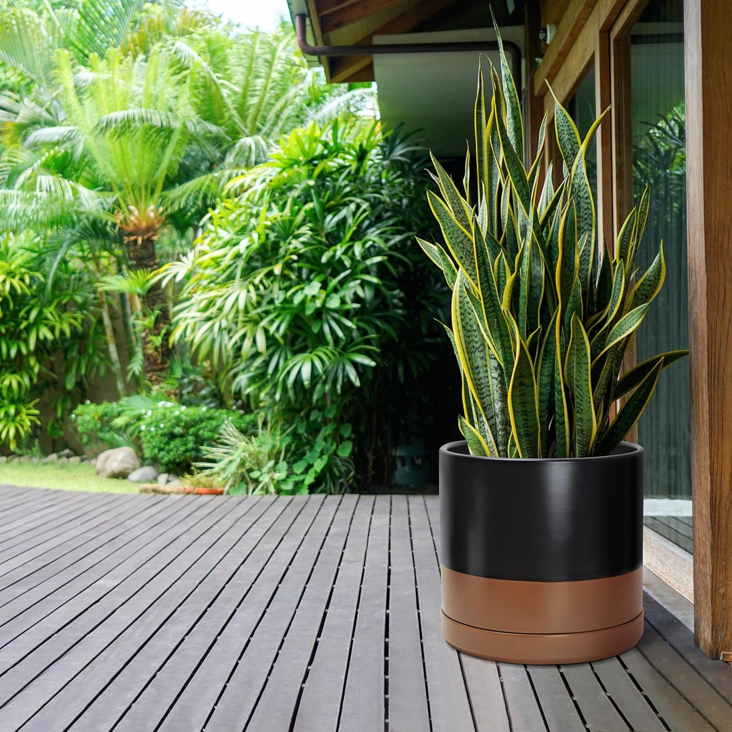 D'vine Dev 14 Inch Ceramic Planter Pot with Drainage Hole and Saucer, Indoor Cylinder Round Planter Pot, Black/Speckled Tan, 94-O-G-7