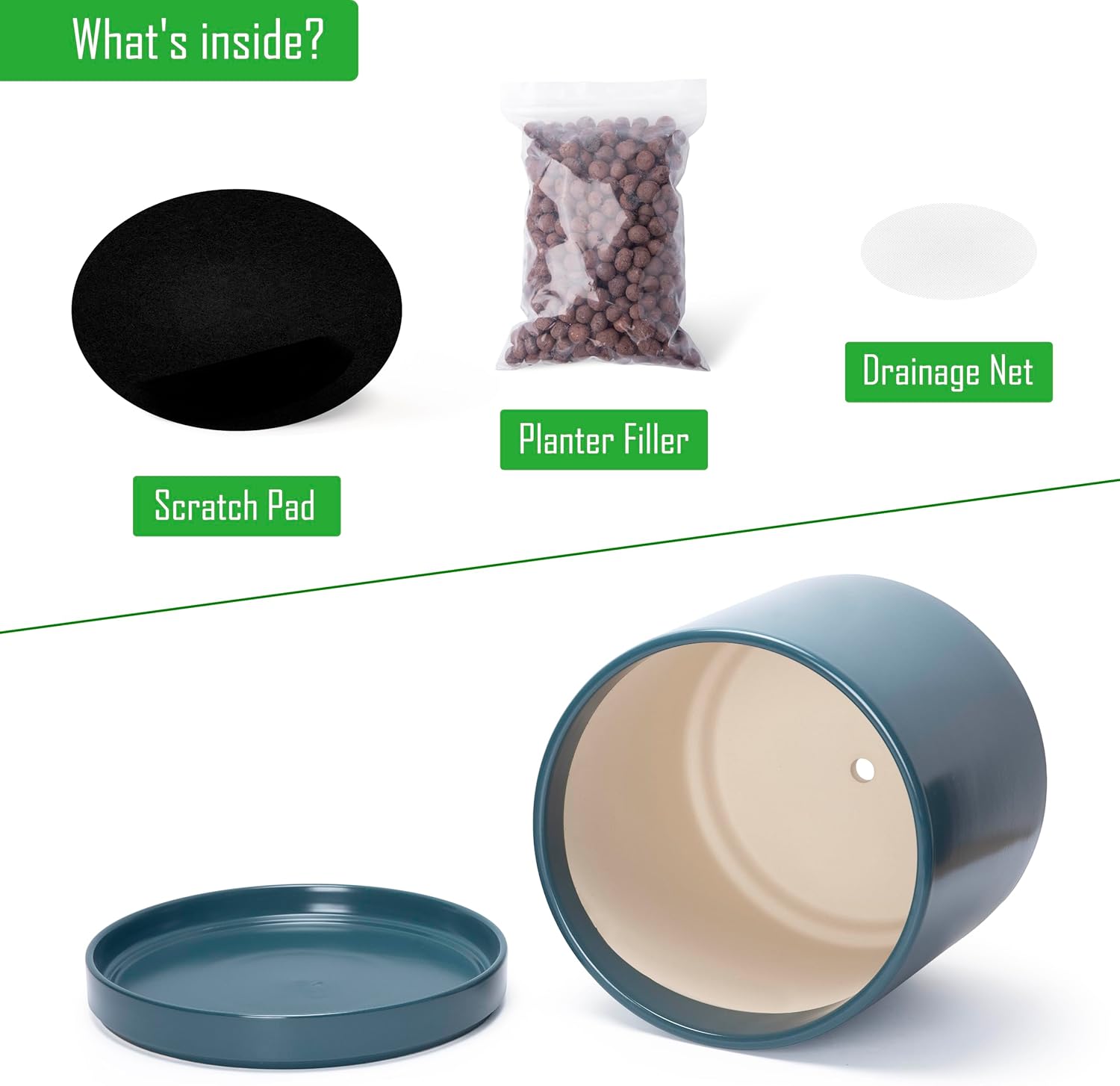D'vine Dev 14 Inch Ceramic Planter Pot with Drainage Hole and Saucer, Indoor Cylinder Round Planter Pot, Teal, 94-O-G-9
