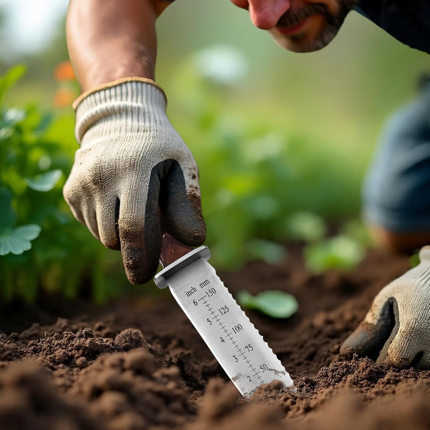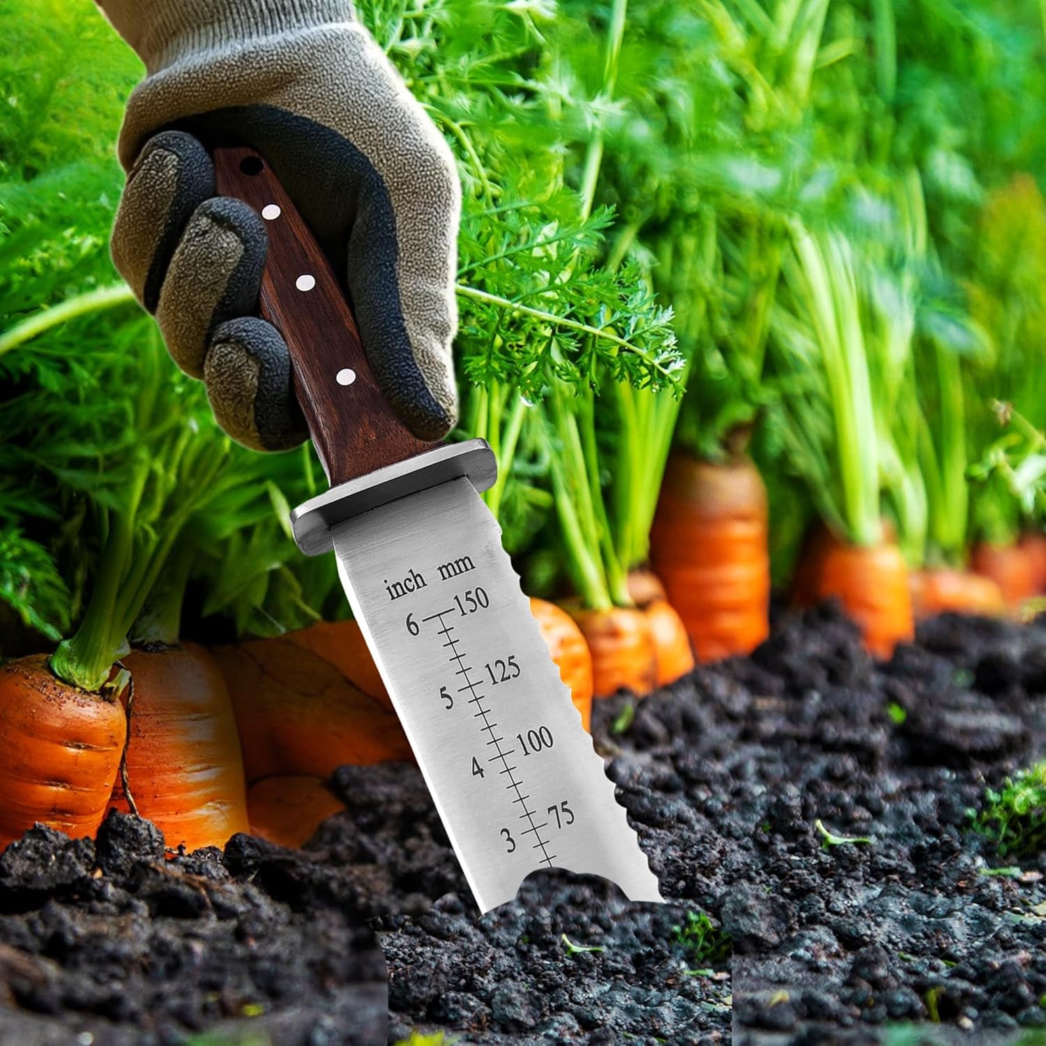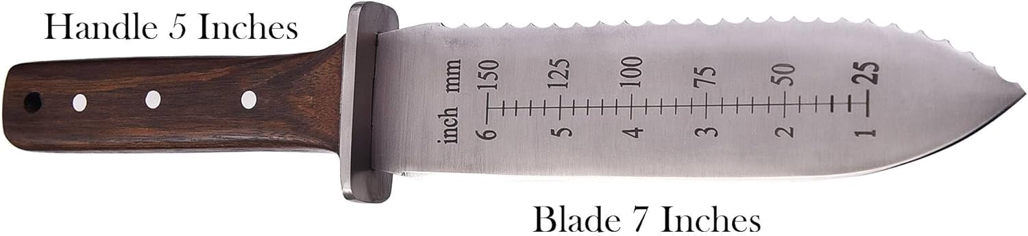 - Wonderfully Versatile: Straight Garden knife for every job in the garden, use it for digging, transplanting, sawing, cutting, removing, dividing, and even measuring soil depth for planting. The blade has a straight edge and a serrated edge, making it easy to saw through tough roots. Easily cuts into soil, with a depth scale marked on one side, so you know exactly how deep you're digging. It allow us to use it as a garden knife, digging knife, weeding knife, garden tool, root cutting knife, scale knife, measuring knife, multitasking knife, etc