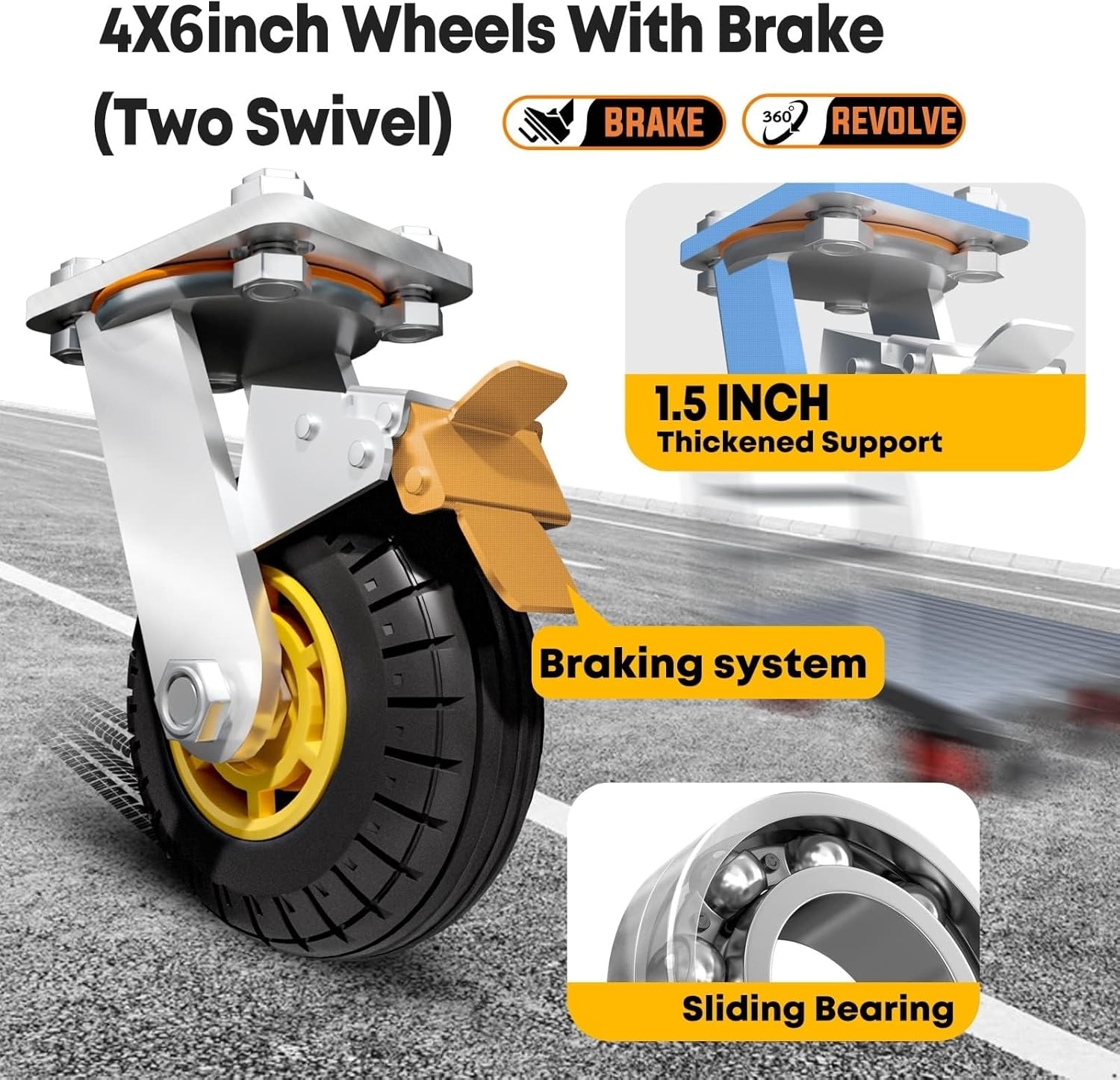 - [Easy Control with BRAKE DESIGN]: 4 wheel flat carts have 2 rigid caster wheels and 2 swivel wheels with BRAKE DESIGN so that you can easily move the extra long push cart dolly in any direction you need and stop in anywhere; 6 inch diameter caster wheels made of solid rubber ensure maneuverability on pavement or gravel