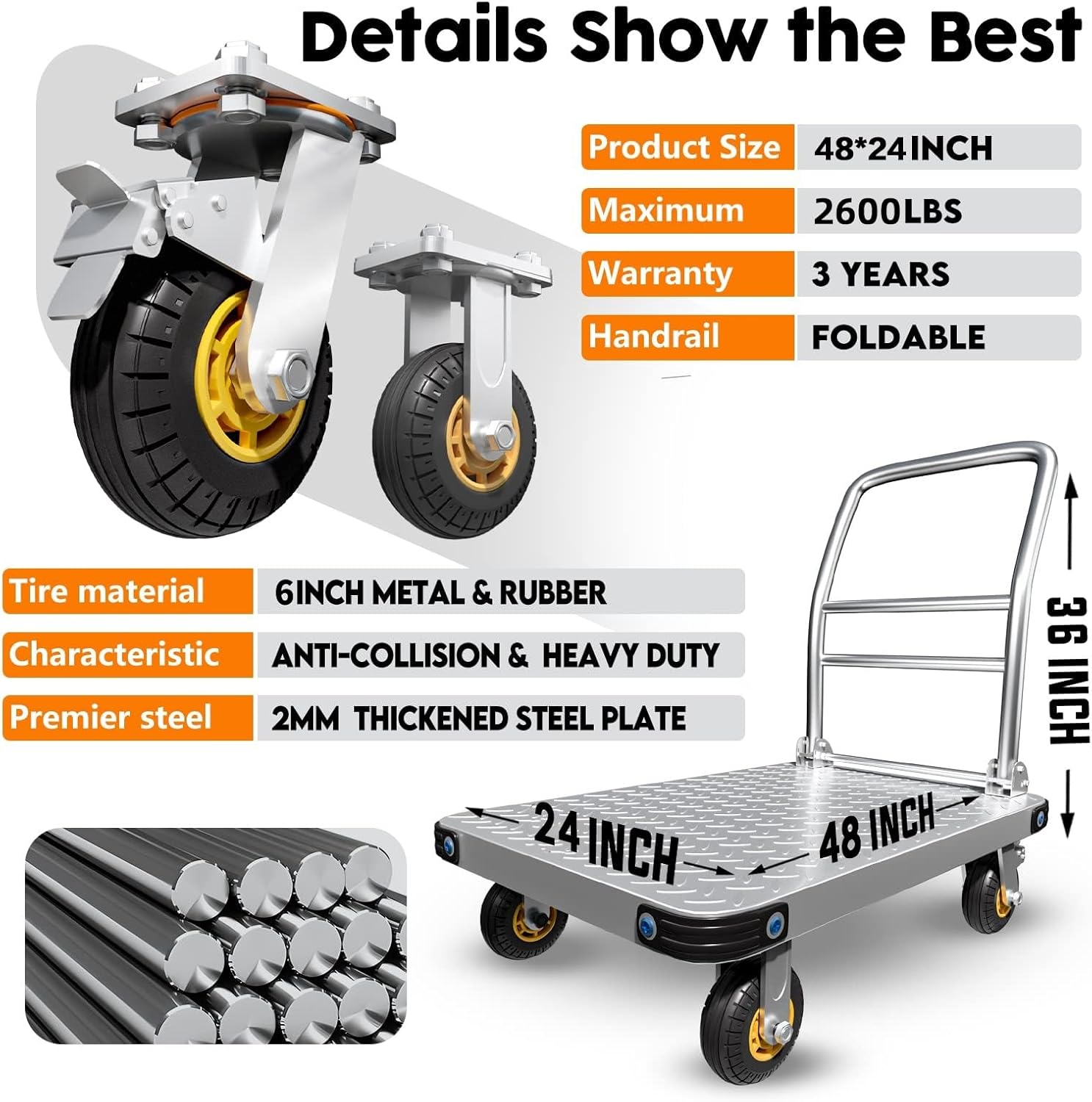 - [Large Capacity]: Due to the thickened steel plate and durable wheels,24 by 48-inch flat cargo cart has a 2600-pound weight capacity