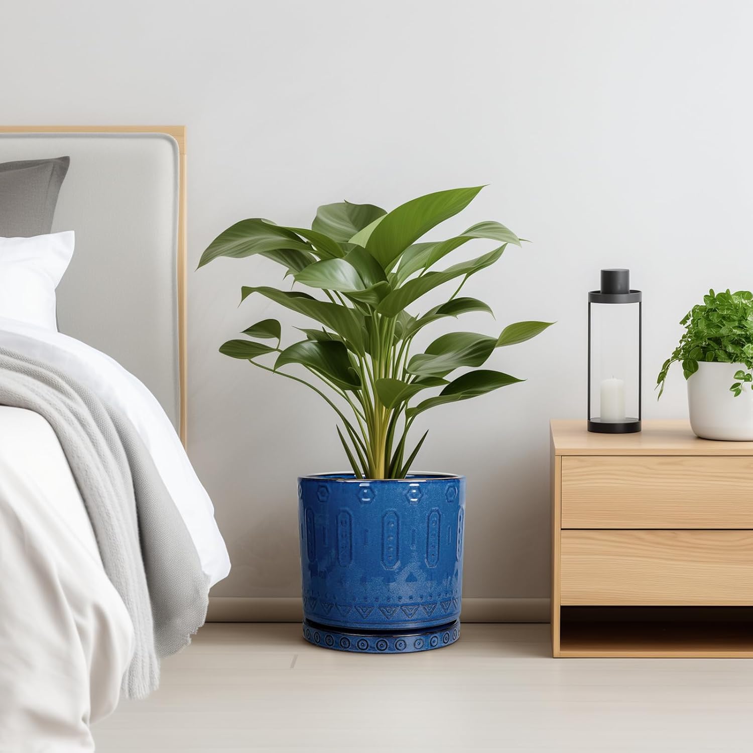 10 Inch Plant Pot - Ceramic Planter Outdoor Plant Pot Indoor with Drainage Holes and Saucer Large Flower Pot Round Decorative Planter for Garden Patio Decor Blue