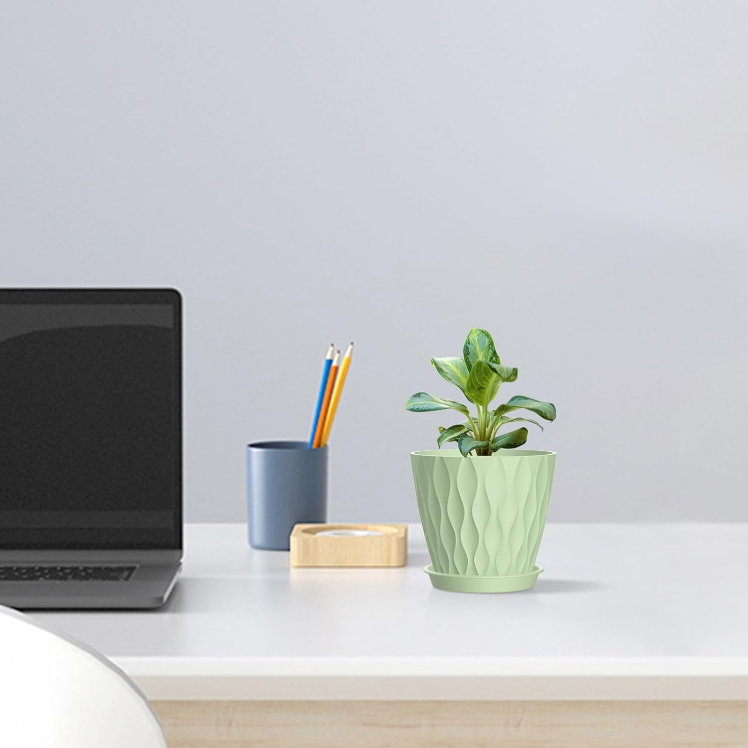 4 inch Small Plastic Nursery Pots, 5 Pack Water Ripples Plant Pots for Indoor Plants, Flower Pots with Drainage Holes and Saucers, Seeding Starter Planters for Decorative, Green
