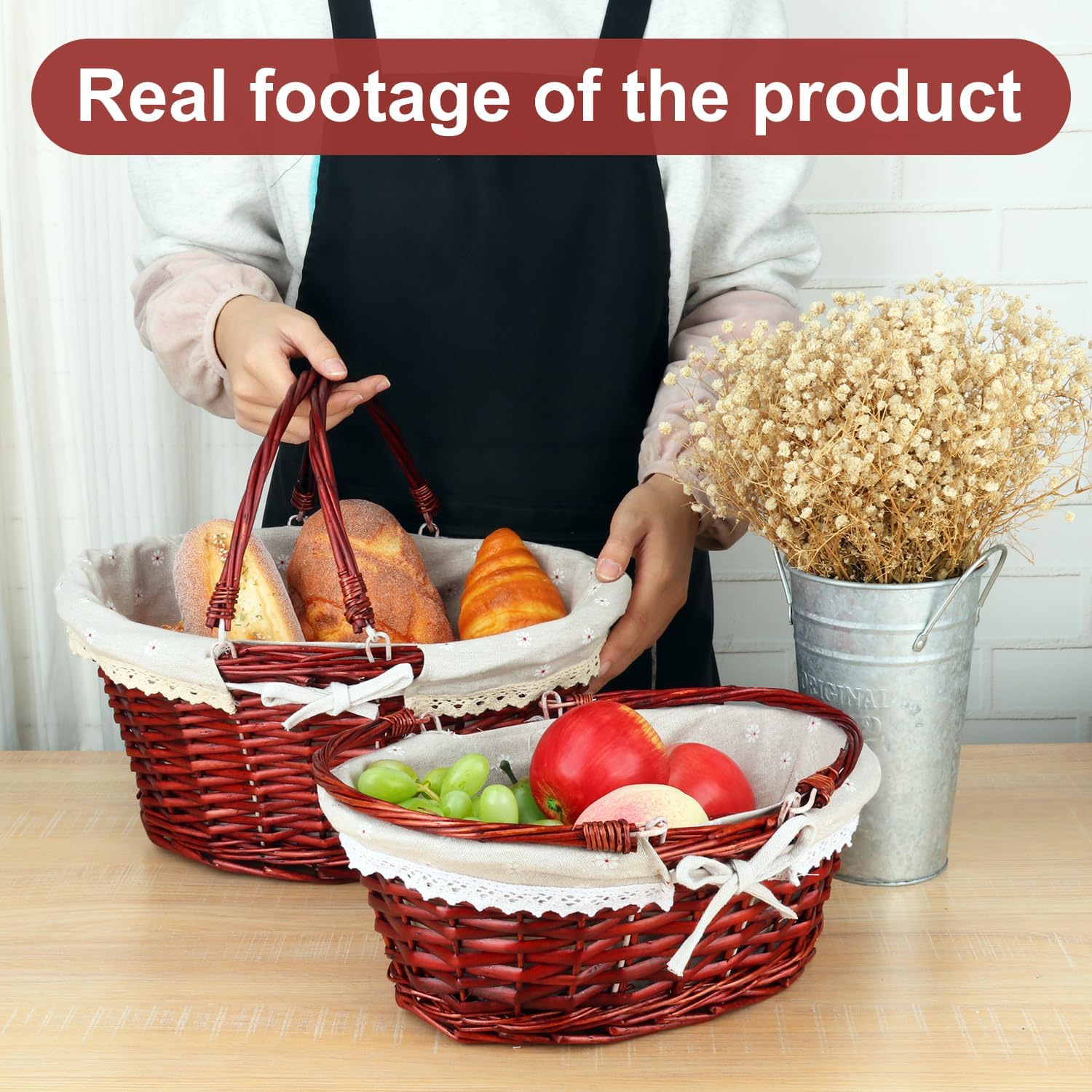 2 Pack Brown Wicker Basket with Linen Lining, 14 & 12 Inch Wicker Woven Picnic Basket with Handle for Picnic, Camping, Outdoor Party