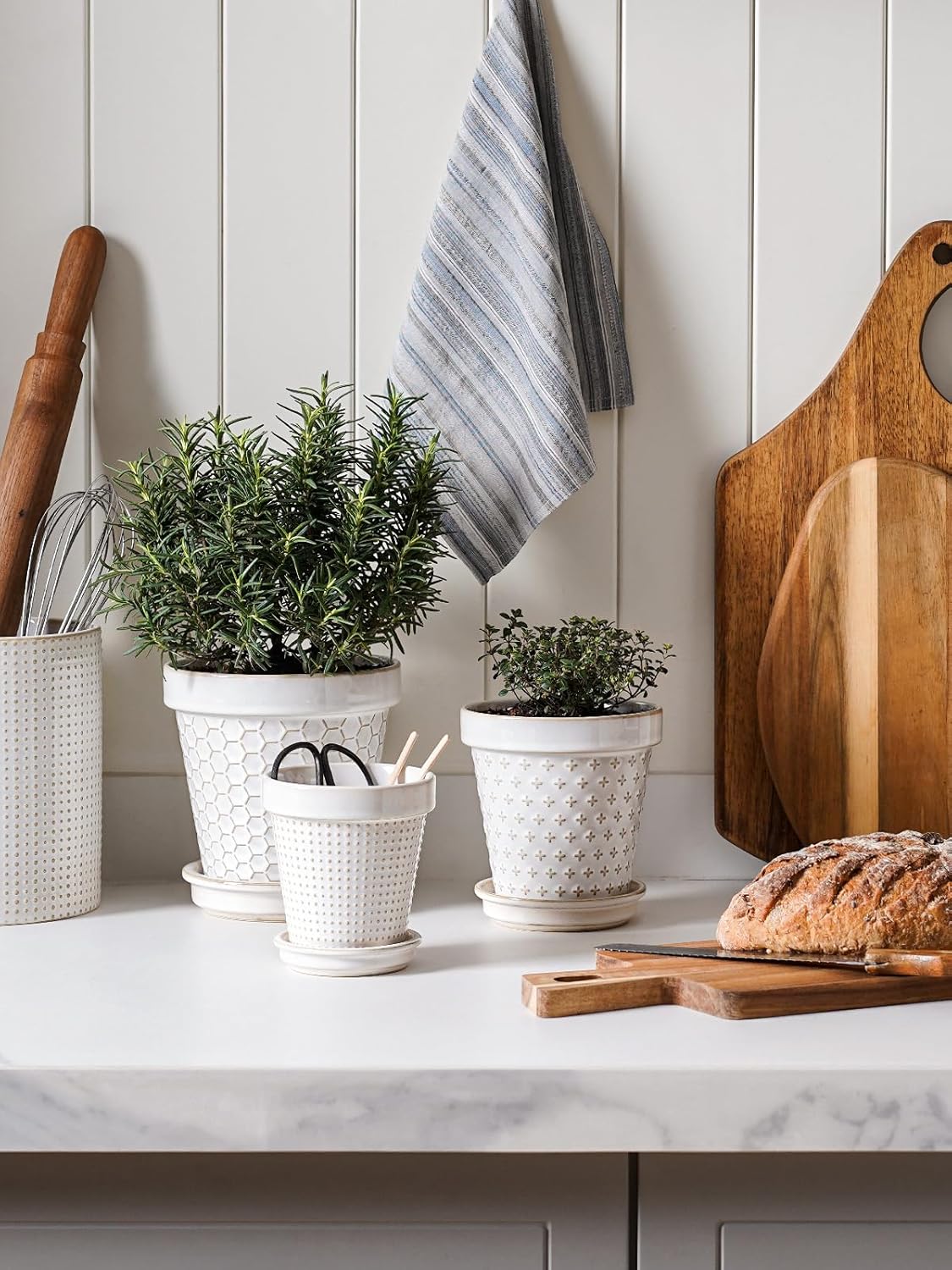 - Elegant Embossed Design: Featuring a unique relief pattern on each pot, this set adds a touch of artistry to any room. The arctic white glaze paired with a light brown pattern creates a timeless, elegant look that beautifully complements the green of your plants, enhancing your living space, bookshelf, or office desk