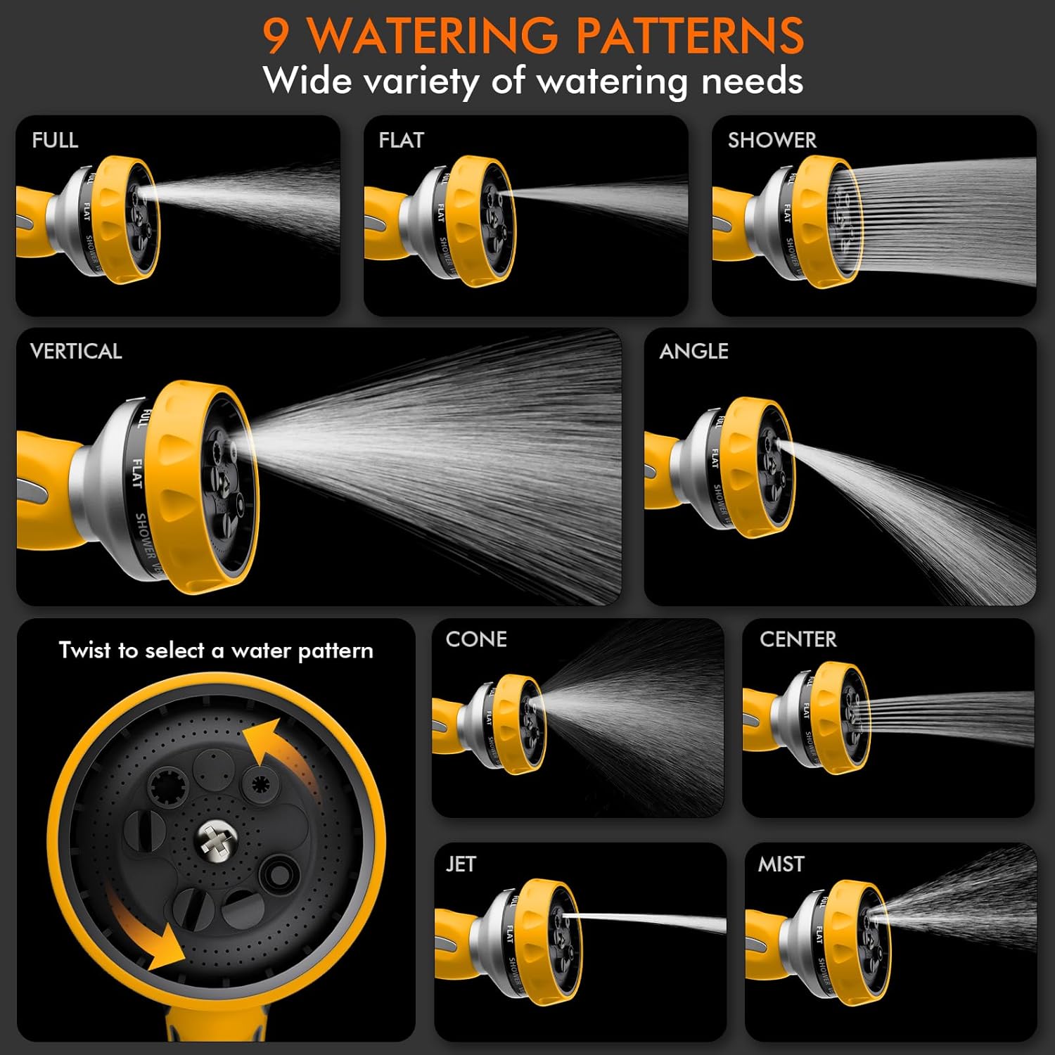 - 【9 Watering Patterns】Rotate the sprayer head dial to select a water pattern from Shower, Flat, Full, Mist, Jet, Center, Cone, Angle and Vertical. Whether you need the high-pressure jet to clean your patio, the useful angle to wash your car, the gentle shower to wash your dog, or the soft mist to water your garden flowers, the 9 patterns have you all covered.