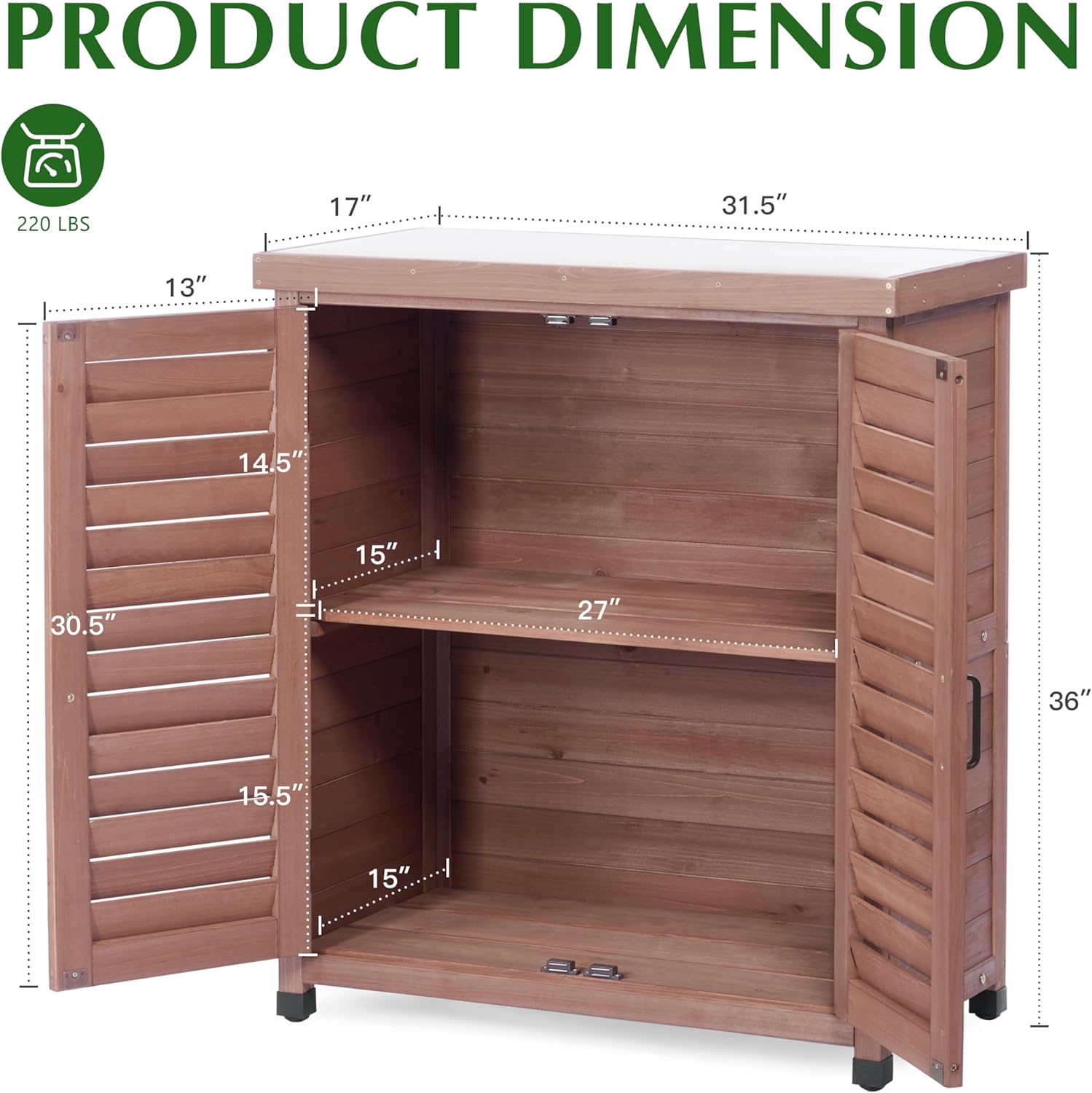 Outdoor Storage Cabinet & Potting Bench Table with Metal Top, Wooden Patio Furniture, Garden Workstation (Dark Brown, 36x31x17in)