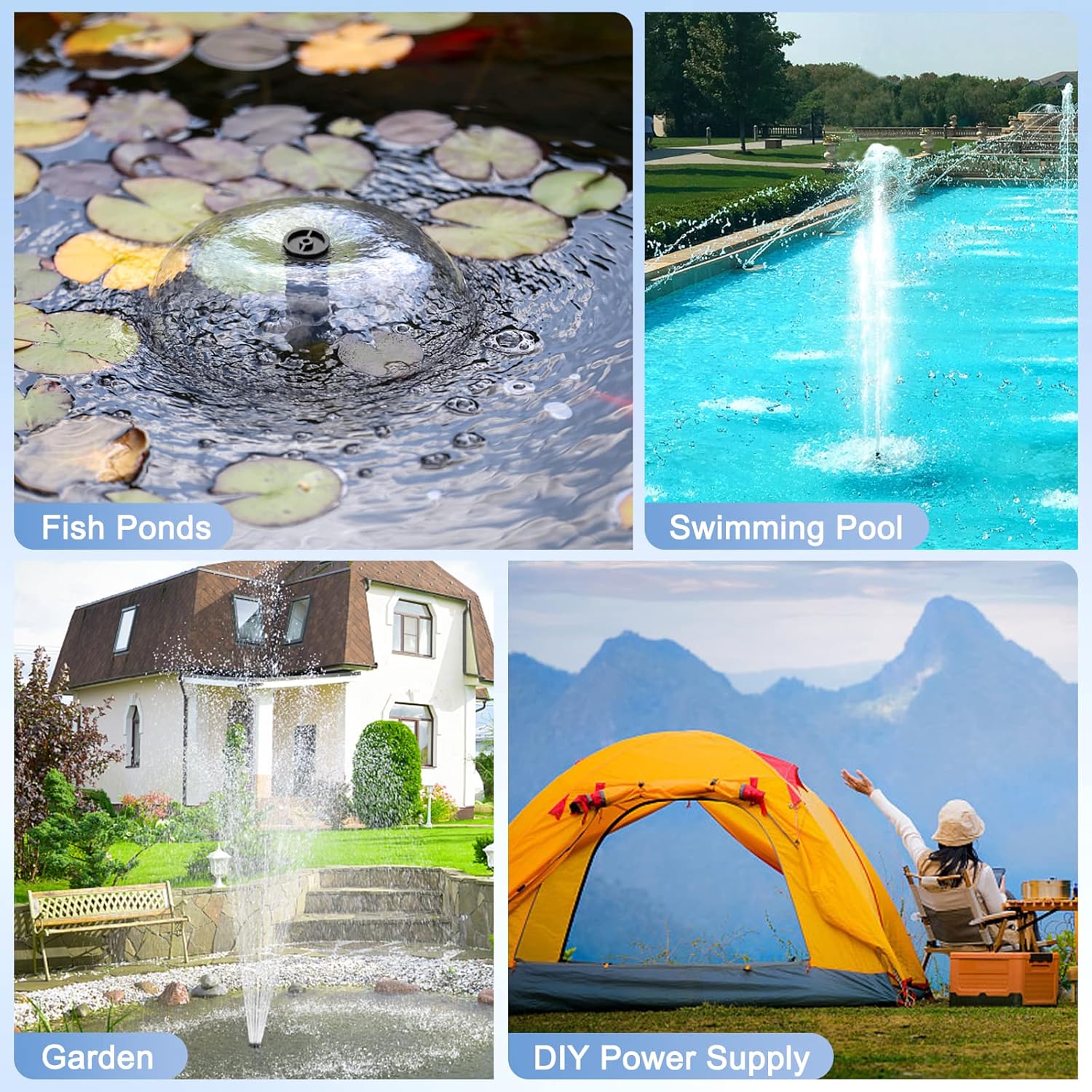- ⛲【Warm Tips & Perfect Service】 1. The solar pond fountain does not work at night and completely cloudy. 2.The solar water pump should be cleaned regularly. 3.The panel should to face the sun. 4. Ensure that the solar water fountain pump must submerged when running. If there is any problem, please let us know, we have professional after-sales support team and will solve it for you quickly.