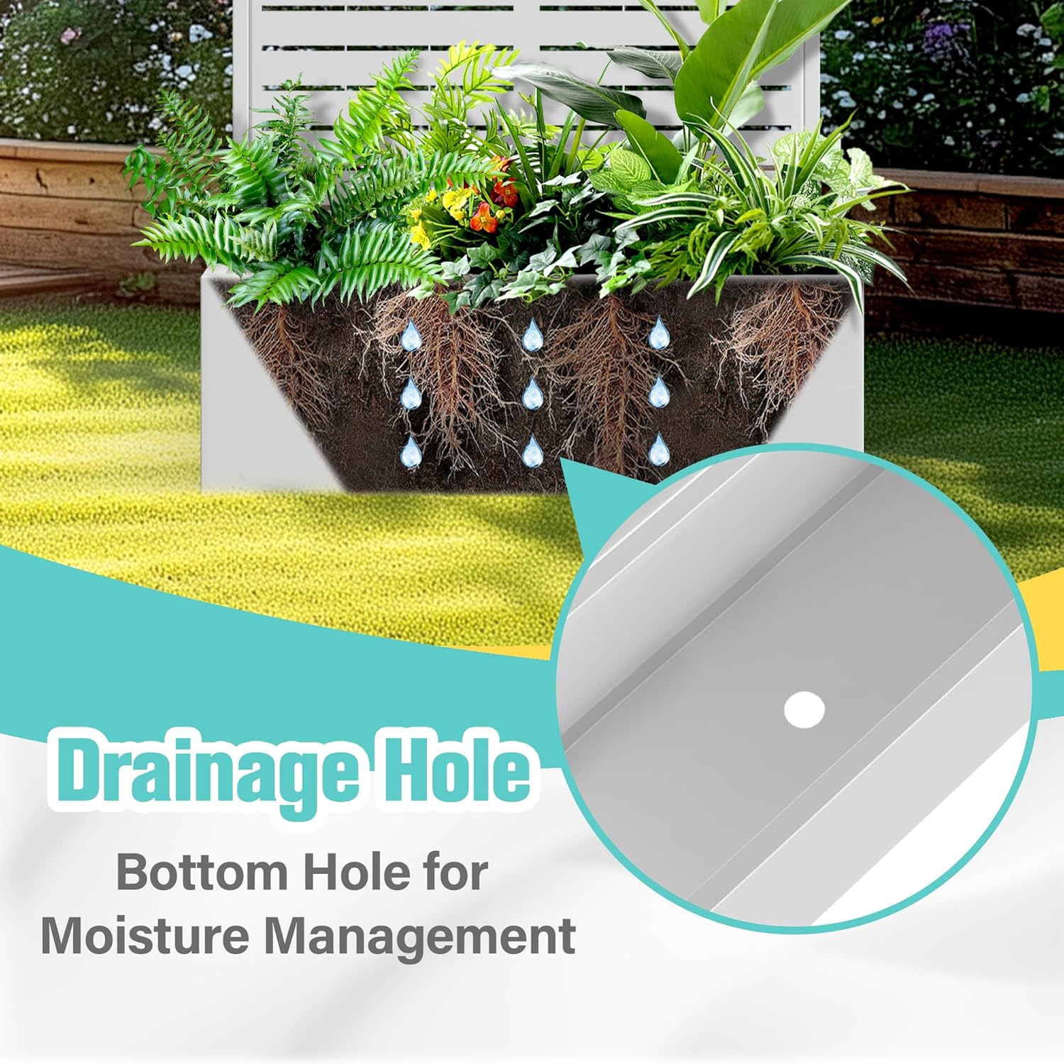 - Built-In Drainage System: The planter box features a 12-inch deep planting bed with drainage holes to prevent waterlogging, ensuring your plants receive the optimal moisture levels for healthy growth.