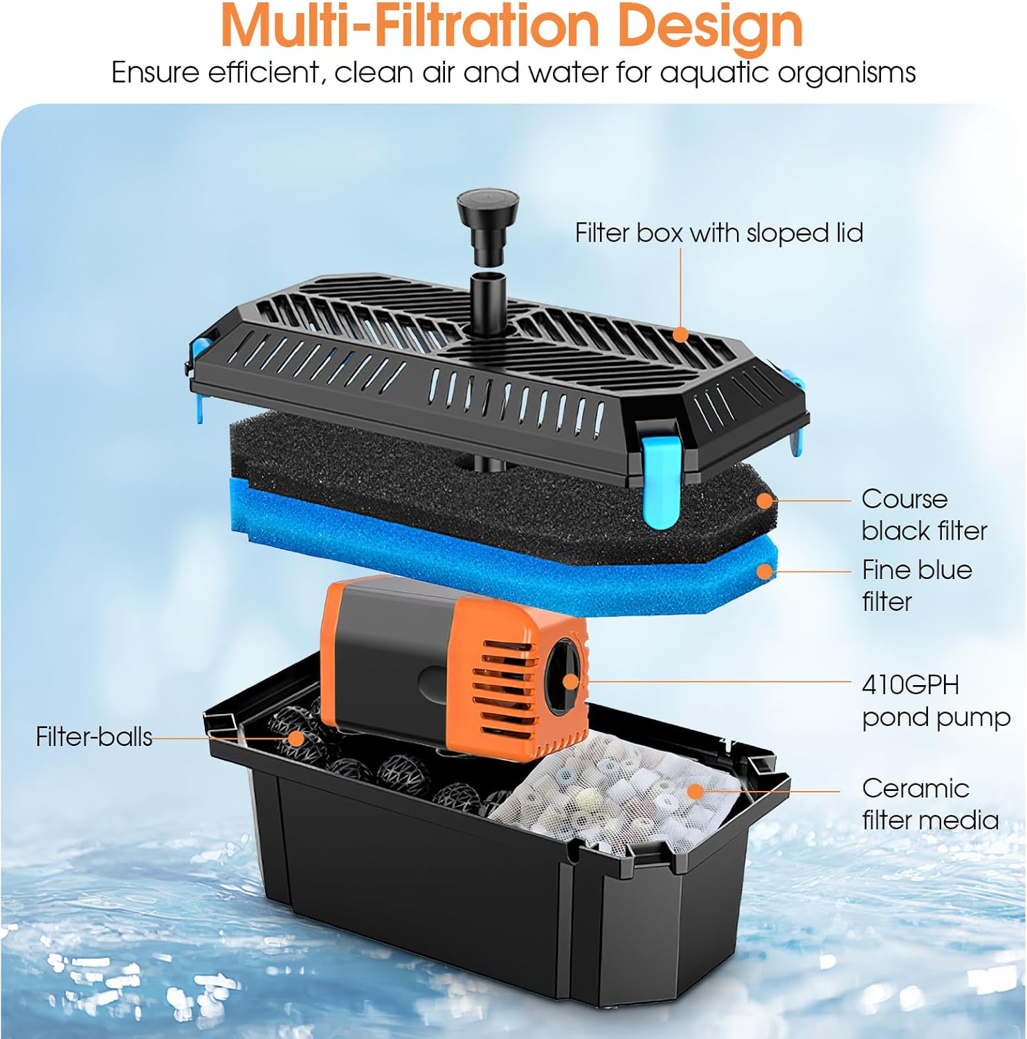 - ⛲【Multi-Protection Filtration System】Solar Pond Pump built-in dry burning protection prevents motor damage, while the filter sponges, bio-balls and ceramic filtrations create an efficient multi-filtration zone. This integrated system significantly enhances water clarity in ponds, water gardens, and fountains, ensuring long-lasting performance and minimal upkeep.This design provides a reliable solution for maintaining crystal-clear water in various water features.