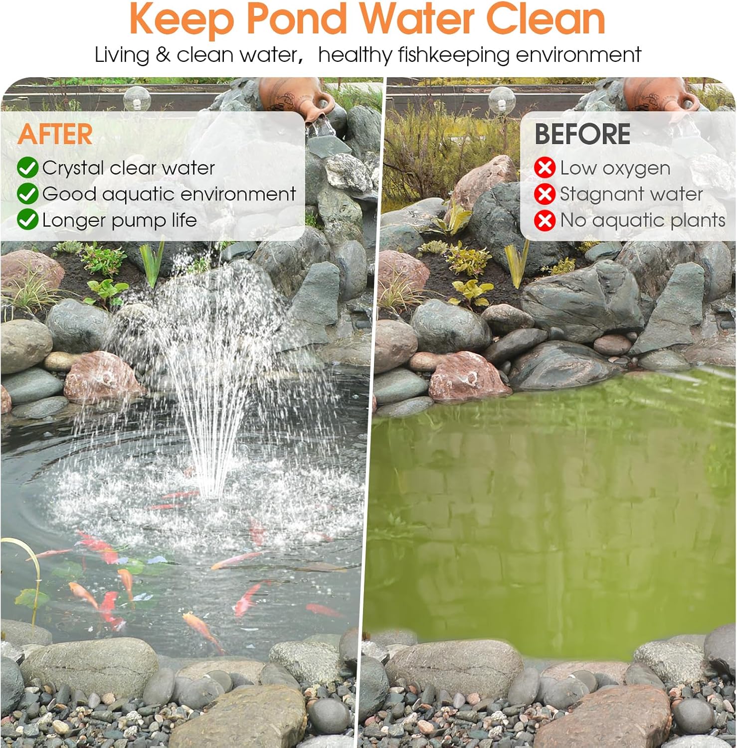 - ⛲【Simple Operation & Wide Applicability】 This solar fountain pump with pond filter for outdoor ponds is delicately designed and easy to assemble, perfect for home gardens, fish tanks, waterfalls, fountains. Customize your water display with 4 different Water Spray nozzles, a diverter valve, and 6.6ft of clear tubing. Use the nozzles and tubing together or separately to create unique water features.