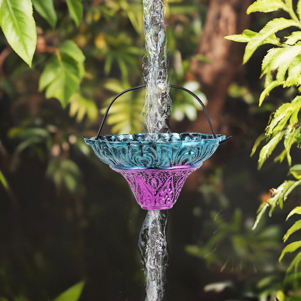 - Functional Alternatives: The metal rain chain consists of exquisite 12 blue-purple gradient flower cups. Full length is 10 FT and fitting for single story standard construction. An elegant alternative to traditional downspouts and it will add a chic touch to your roof