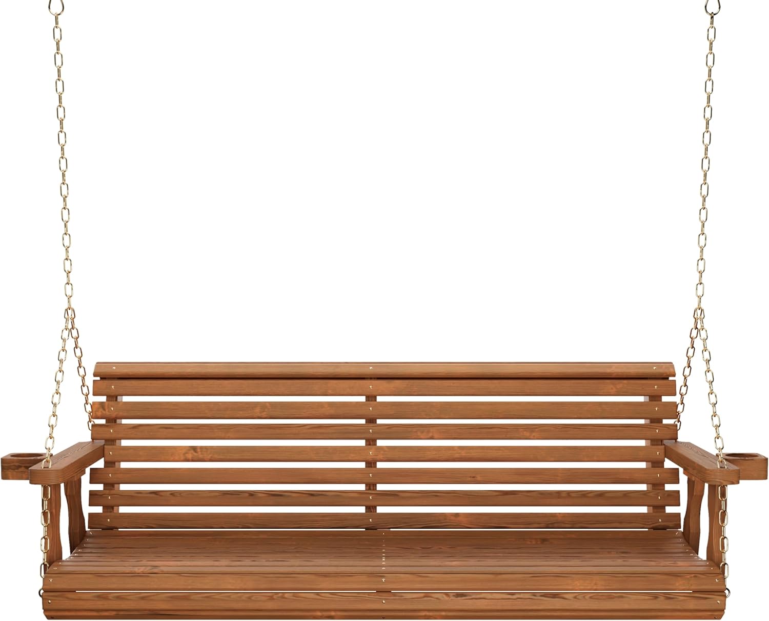 Amish Casual 5 Foot Roll Back Porch Swing with Cup Holders in Oak Stain - Amish Made in The USA from Treated Pine Heavy Duty 700 Lb. Weight Capacity