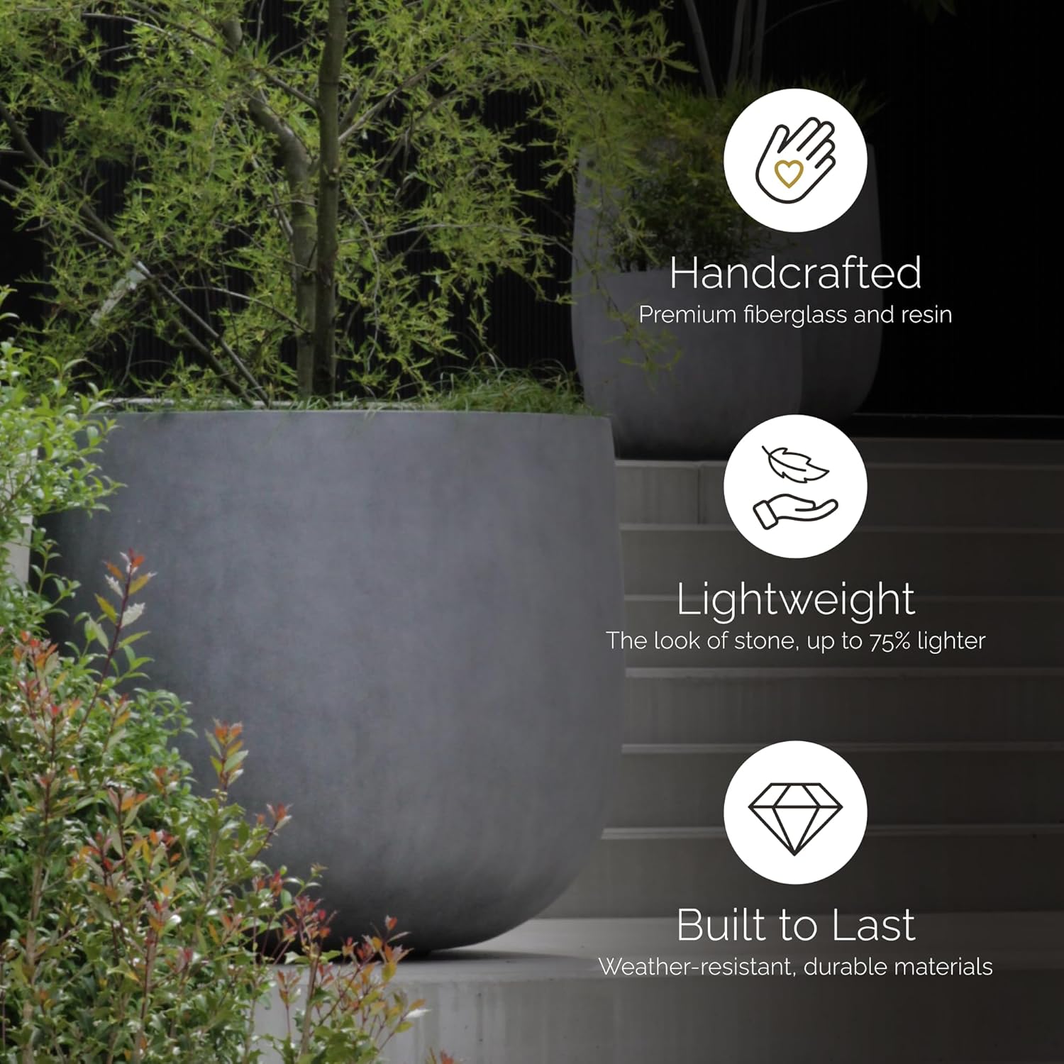 - LIGHTWEIGHT DURABILITY – Constructed from premium fiberglass and resins, the waterproof exterior offers the look of concrete—without the weight—for easy installation and moving.