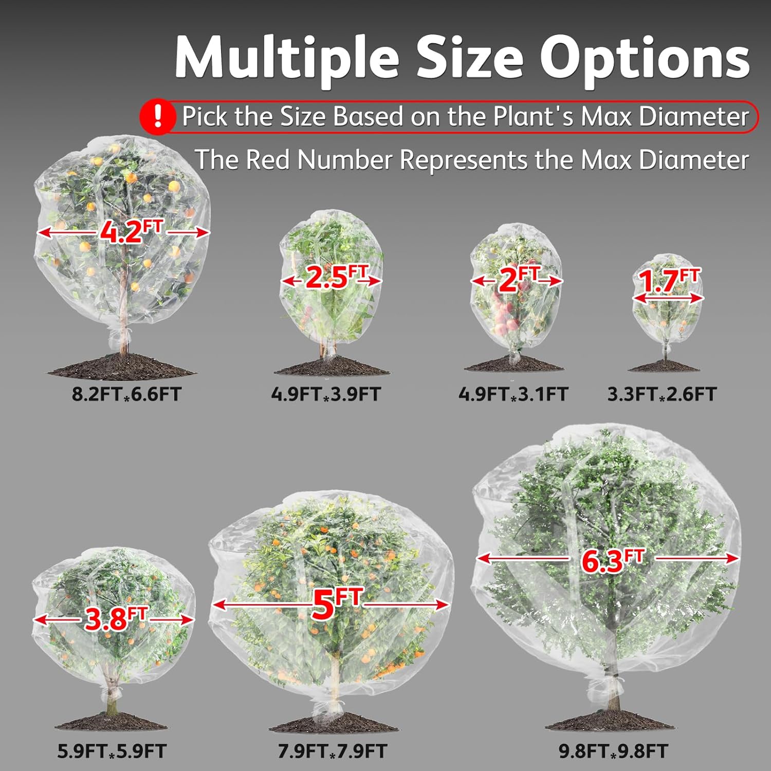 - JOJOLEE Garden Net Kit: This kit includes 2 packs of 7.8 ft(H) x 7.8 ft(W) garden net with a spread diameter of 5 ft. Before buying, please take the time to check the diameter and height of your plant to make sure the insect netting is sufficient to cover it.