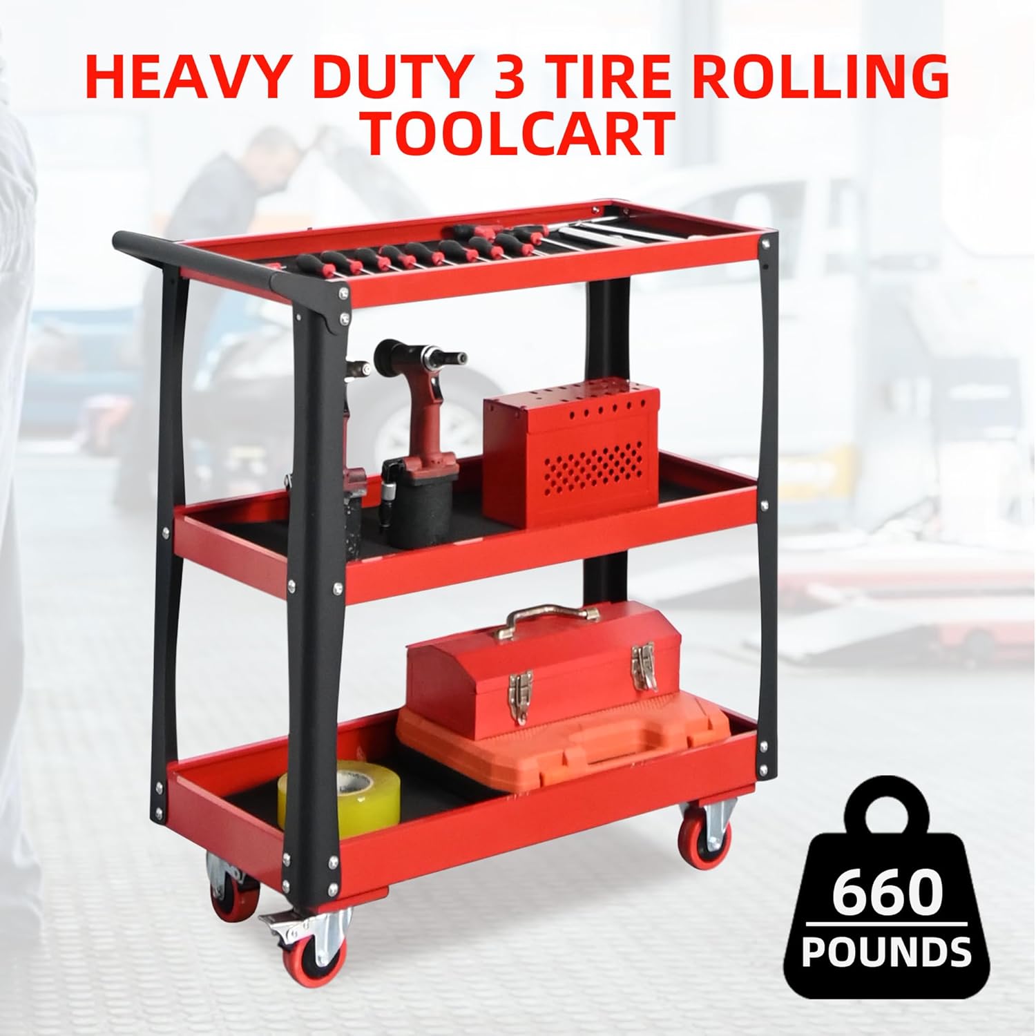 3 Tier Tool Cart with Wheels, Heavy-Duty Steel Utility Rolling Cart, 660 lbs Loading Capacity for Workshop, Garage, Warehouse, Repair Shop