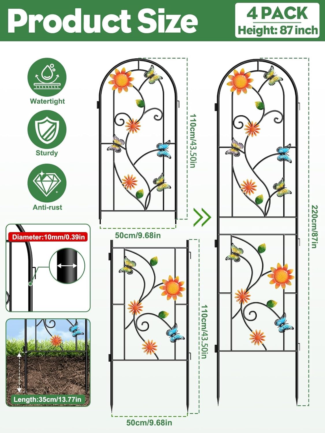 - Heavy-duty Metal Trellis: The plants supporting trellis is made of thickened, welded metal and treated with advanced coating technology to withstand harsh outdoor conditions. Our butterfly-themed trellis offers sturdy support for various climbing plants, including roses, cucumbers, wisteria, petunias, and more.