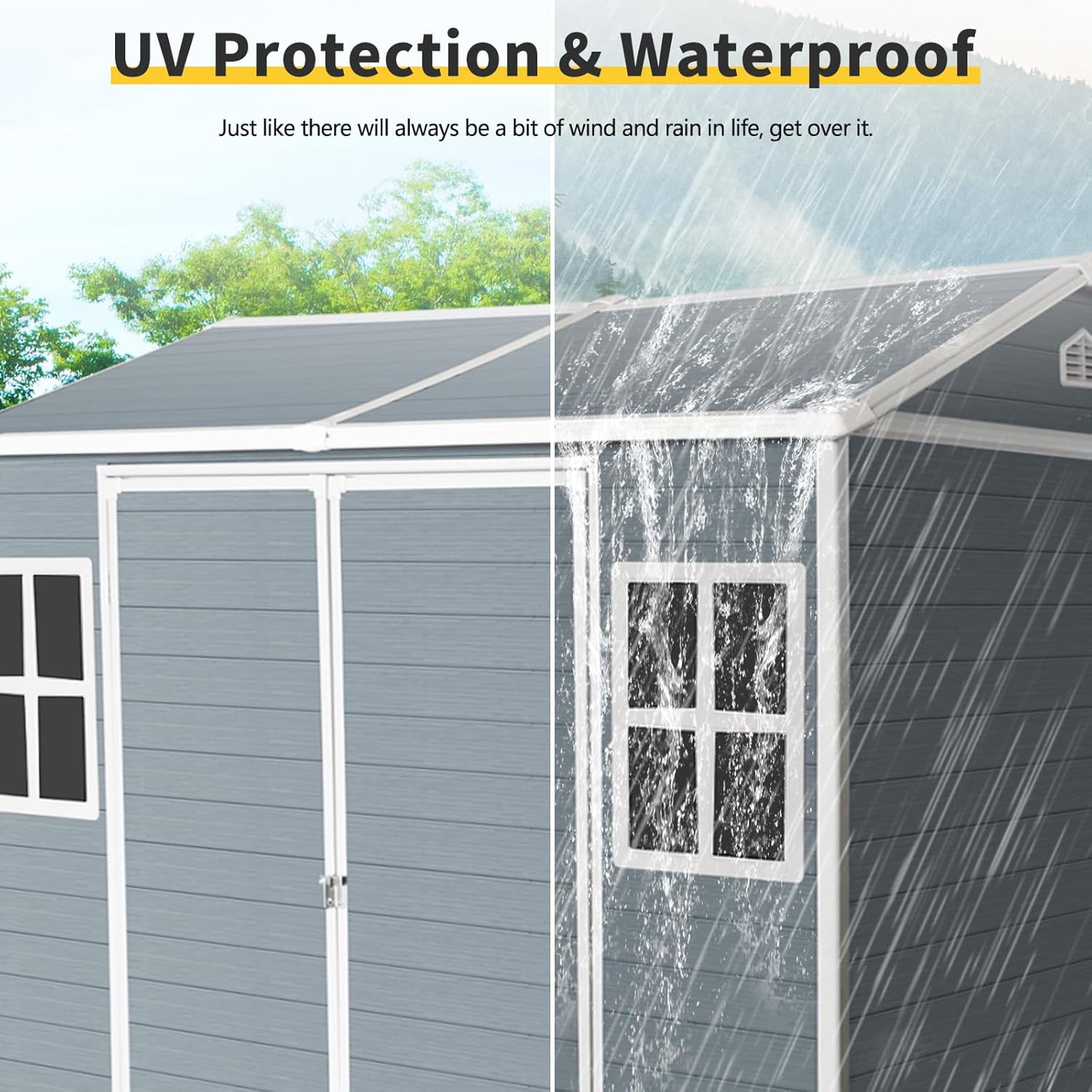 - 🏠 Durable & Weather-Resistant Construction: Crafted from premium resin materials, this 8x6 ft outdoor resin storage shed offers outstanding durability and weather resistance. Its UV-resistant surface prevents fading from sun exposure, ensuring vibrant color and long-lasting performance. Perfect for storing garden tools, patio furniture, and outdoor equipment year-round.