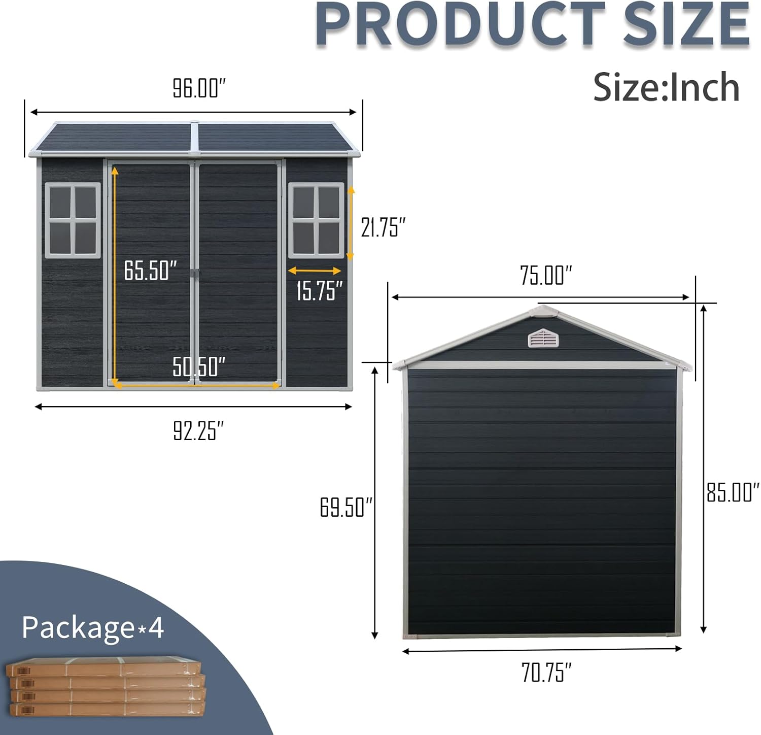 - 📦 Spacious 8x6 FT Design: With dimensions of 96"L x 75"W x 85"H, this 8x6 ft outdoor sheds with floor provides ample storage for gardening tools, lawn equipment, bicycles, and patio furniture. Delivered in 4 packages for easy transportation and handling, it's an ideal addition to your backyard, patio, or garden.