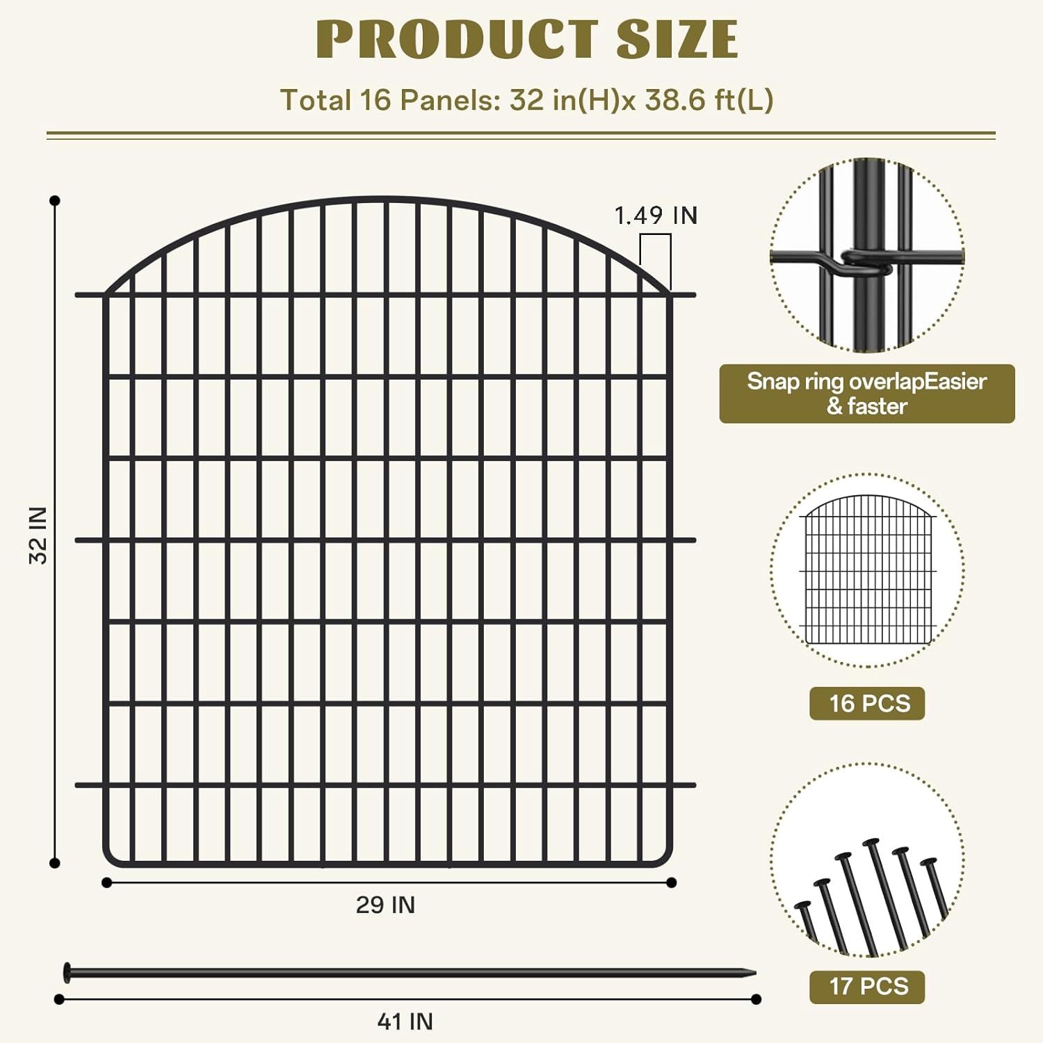 - TALL GARDEN FENCE - Single panel fence size: 32 in (H) X 29 in (L), total 16 panels size: 32in (H) X 38.6ft (L). The height is enough to block large dogs, and the longer length to meet more of your needs, you can connect these fences to any shapes you need